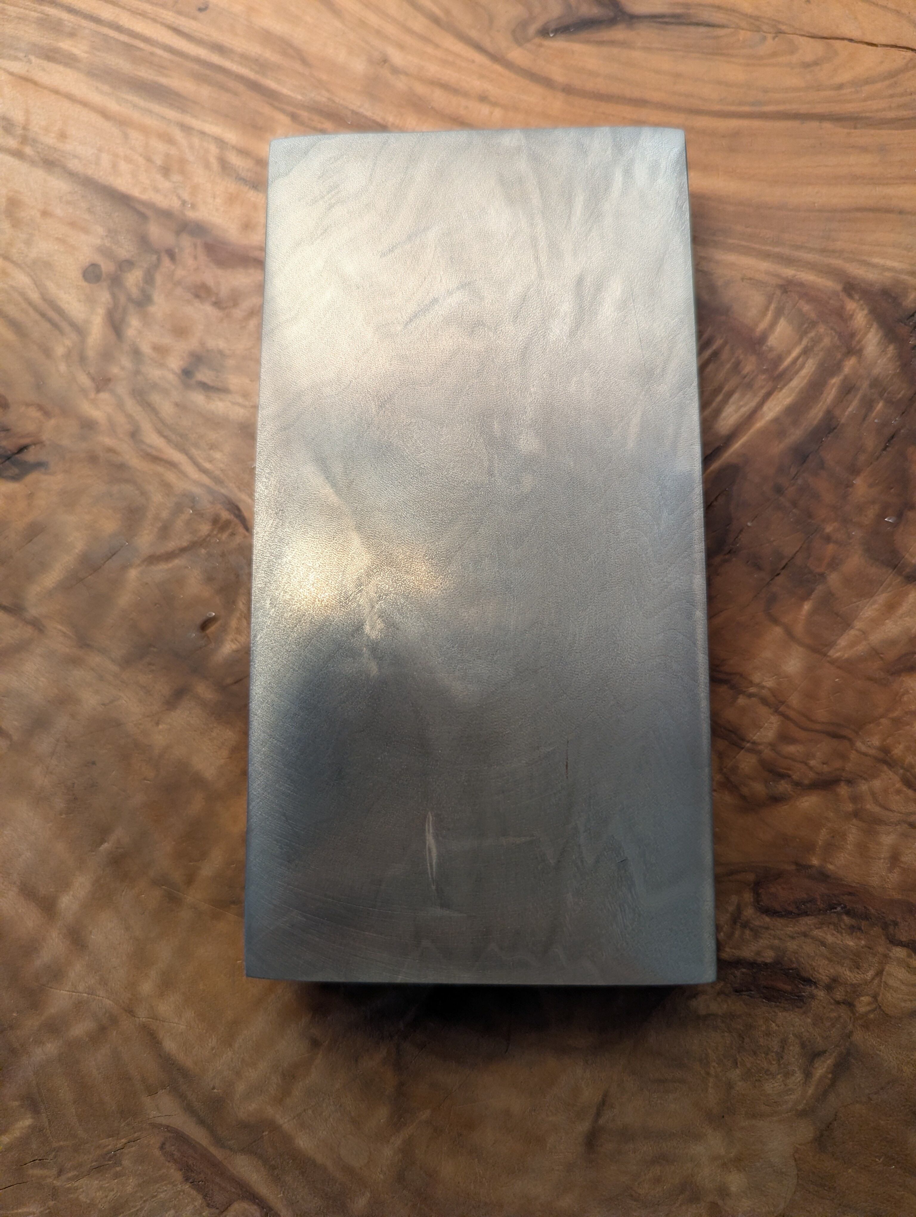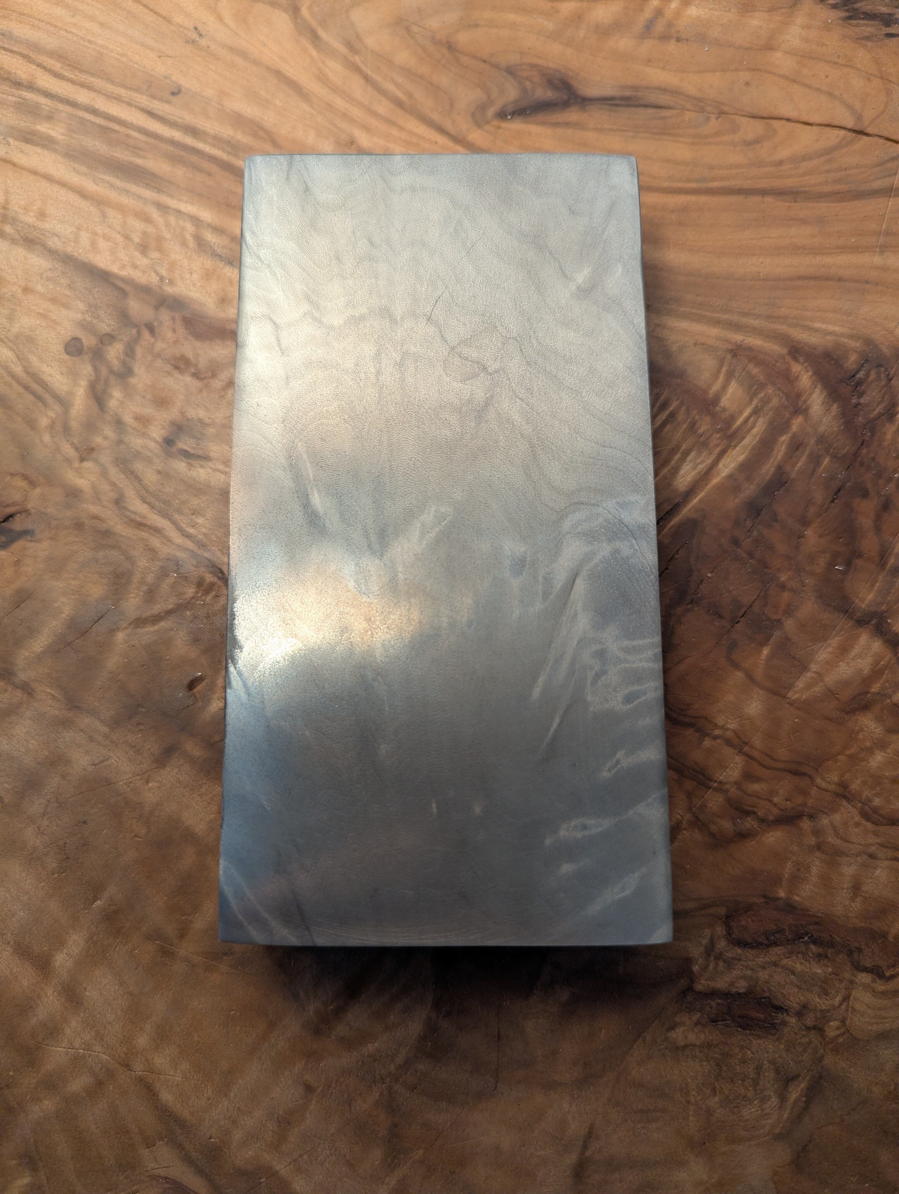 木材(トチ)に金属を含浸させた材料です。角度によって表情を変える鯖杢が銀色に強調されており、光を反射してギラギラとダイナミックに輝きます。