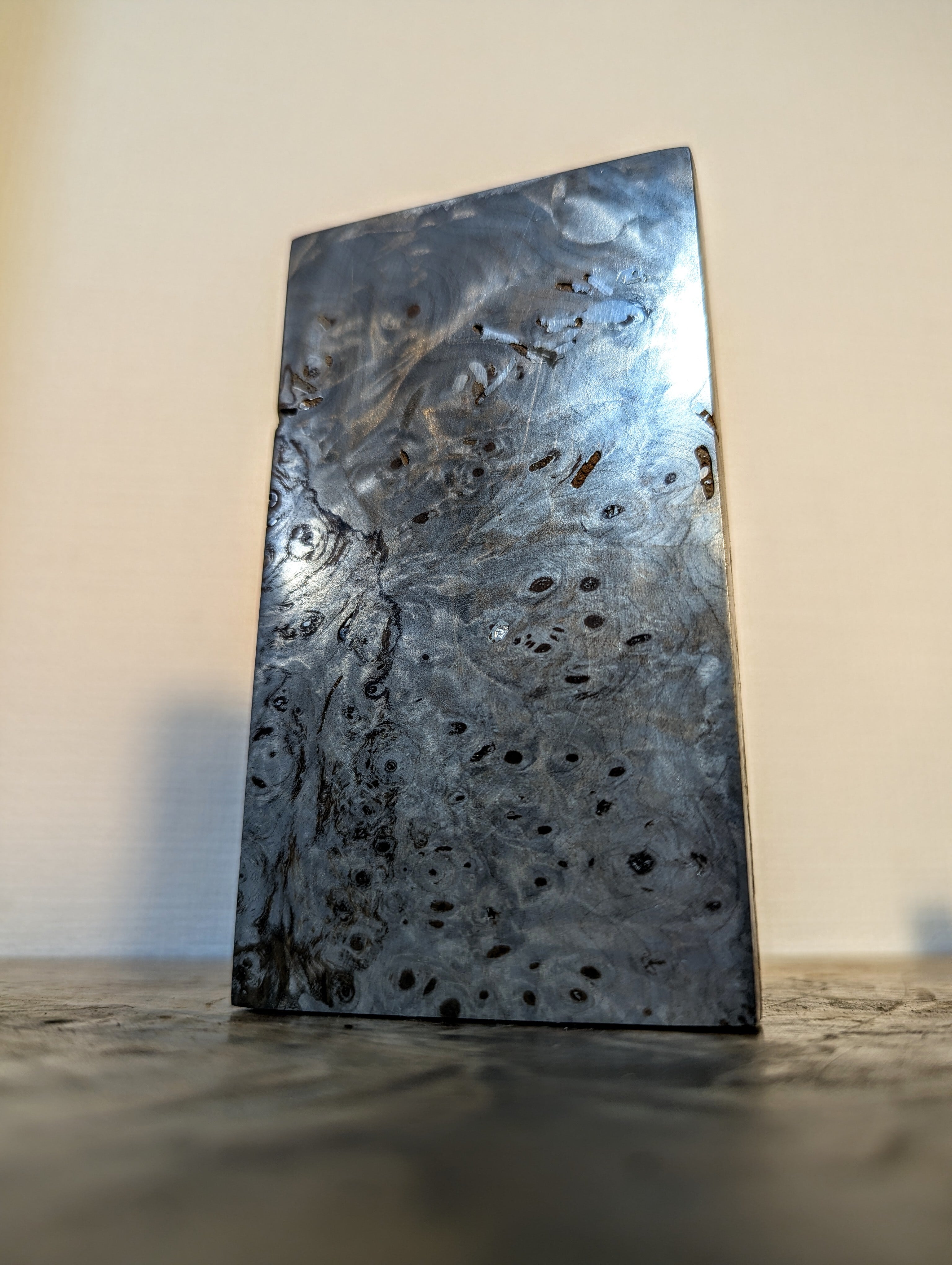 木材(メープル)に金属を含浸させた材料です。複雑な瘤杢がメタリックに強調されており、光を反射してギラギラと光ります。