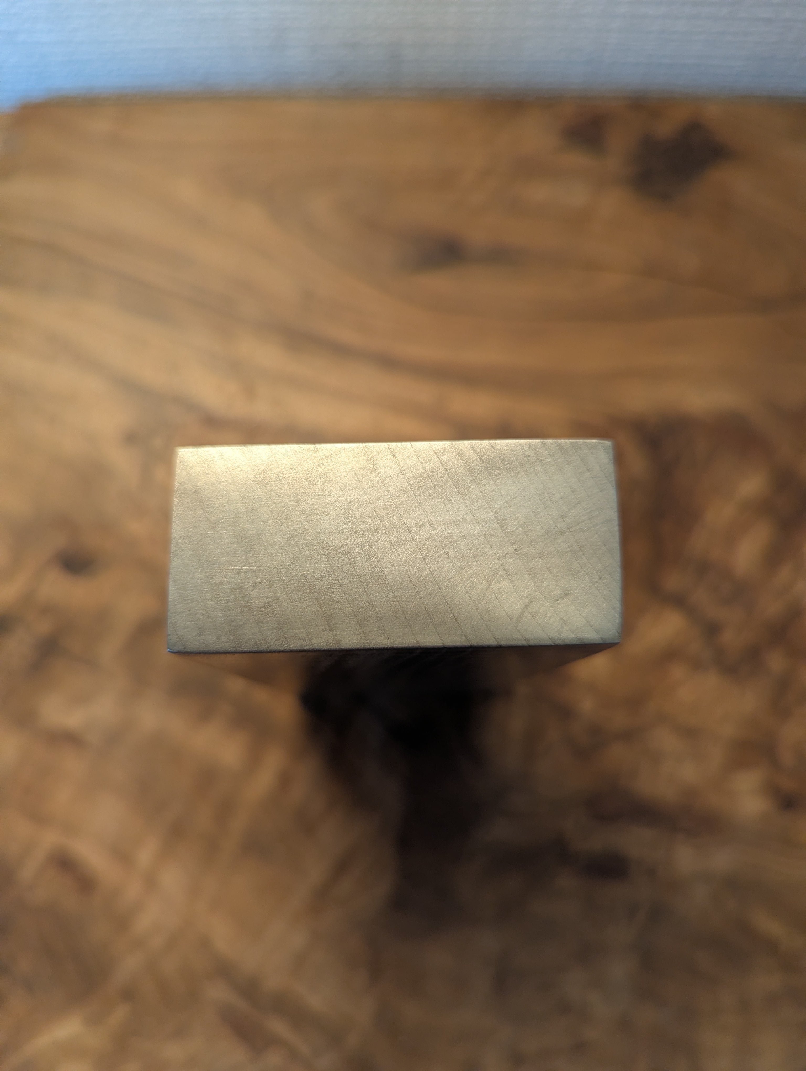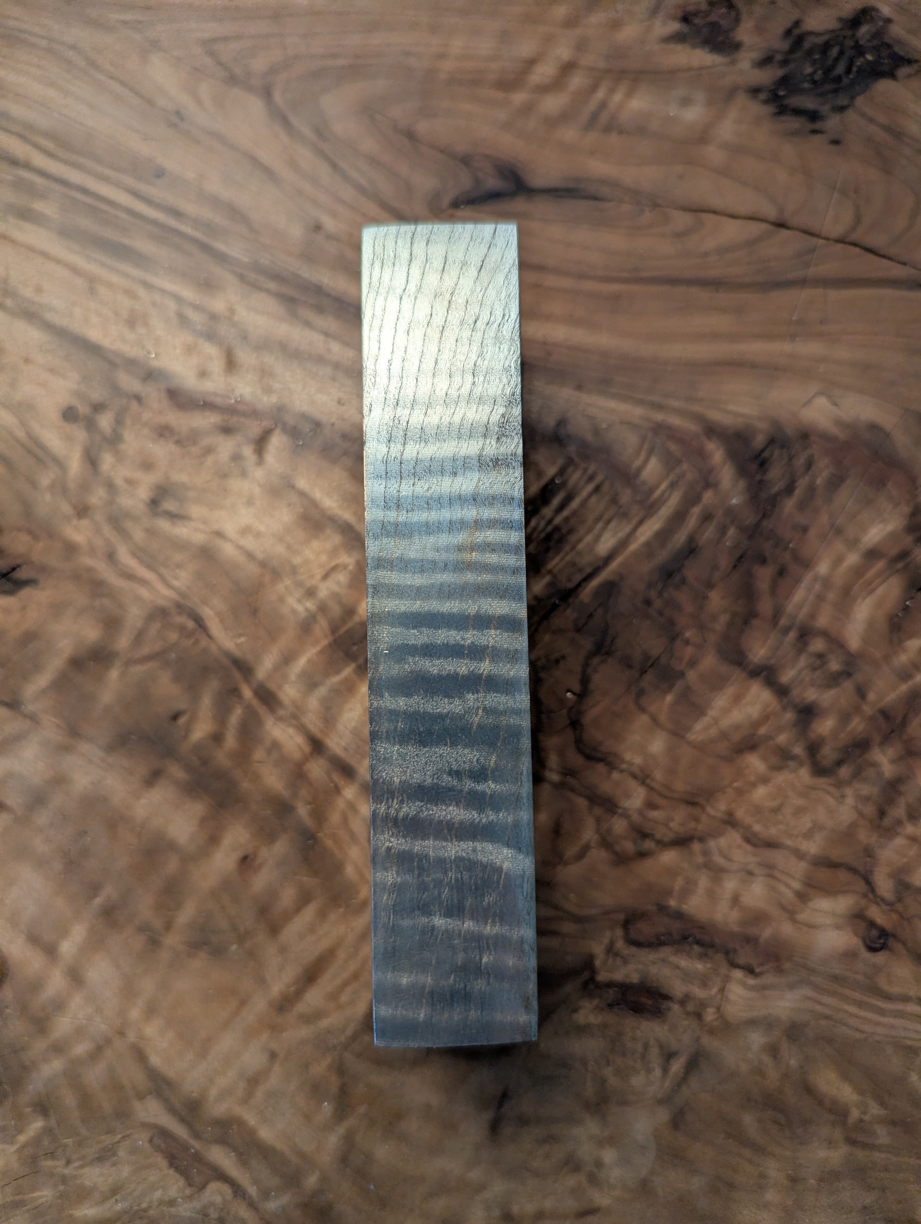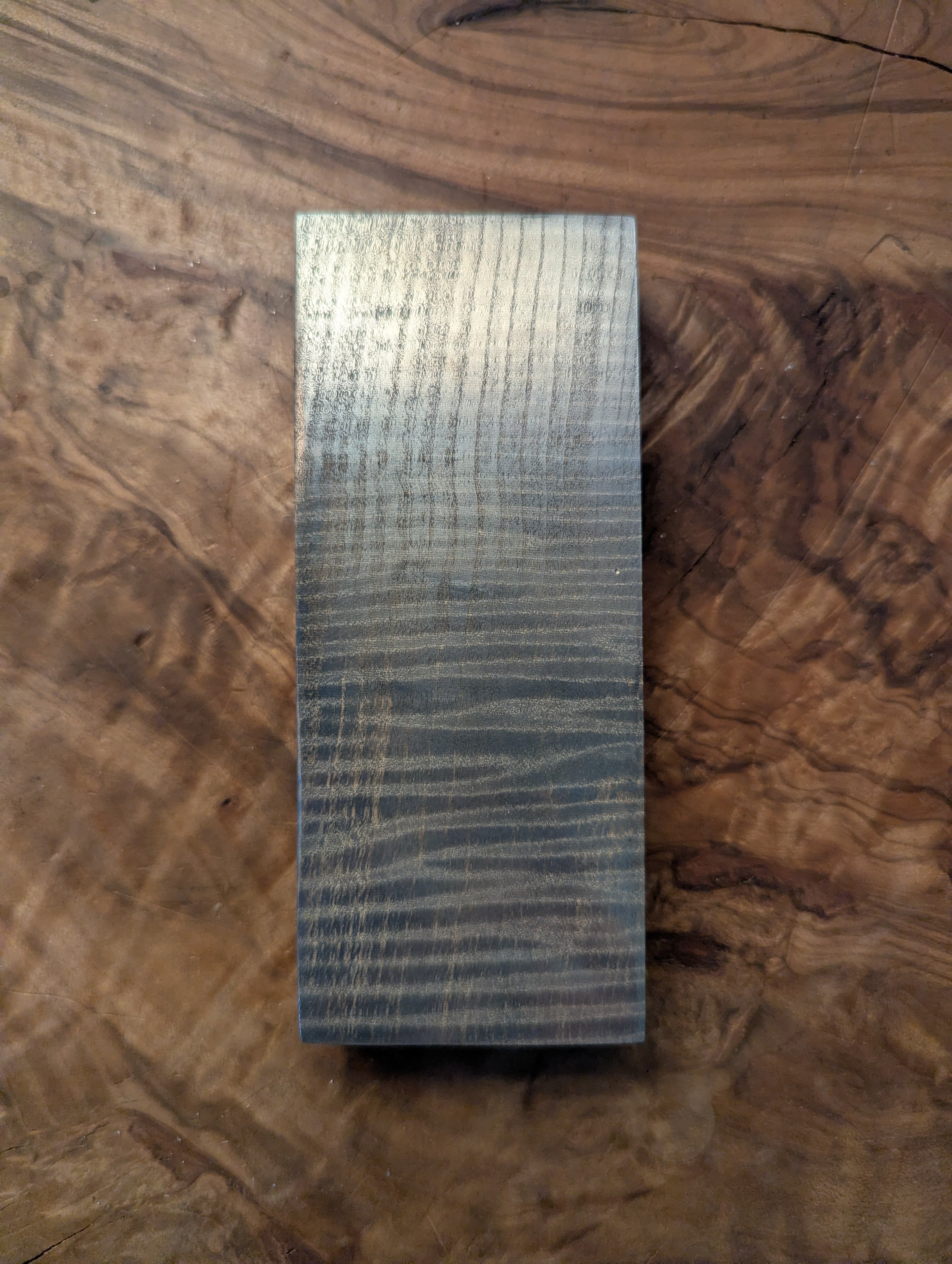 木材(トチ)に金属を含浸させた材料です。木目と縮杢が銀色に強調されており、光を反射してギラギラとダイナミックに輝きます。