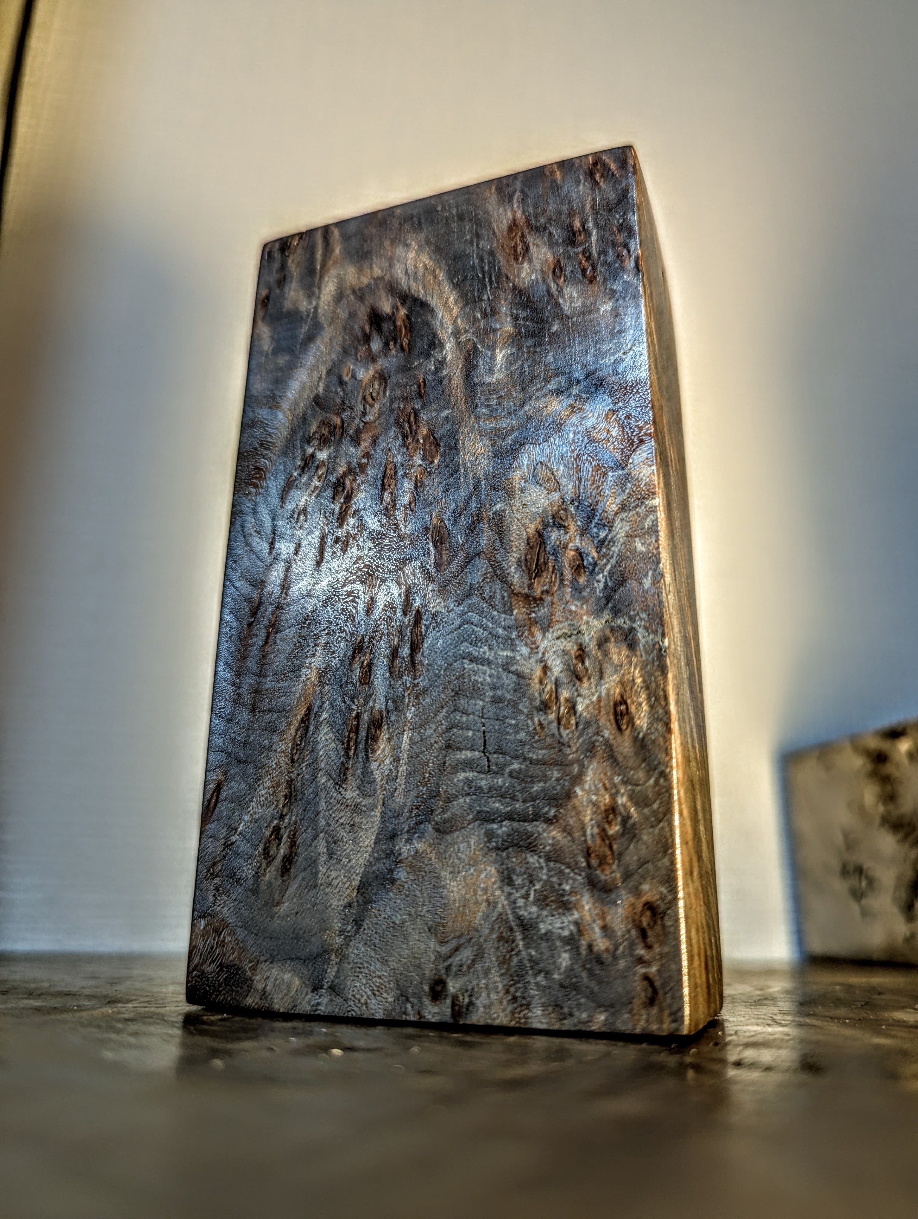 木材(メープル)に金属を含浸させた材料です。複雑な瘤杢がメタリックに強調されており、光を反射してギラギラと光ります。