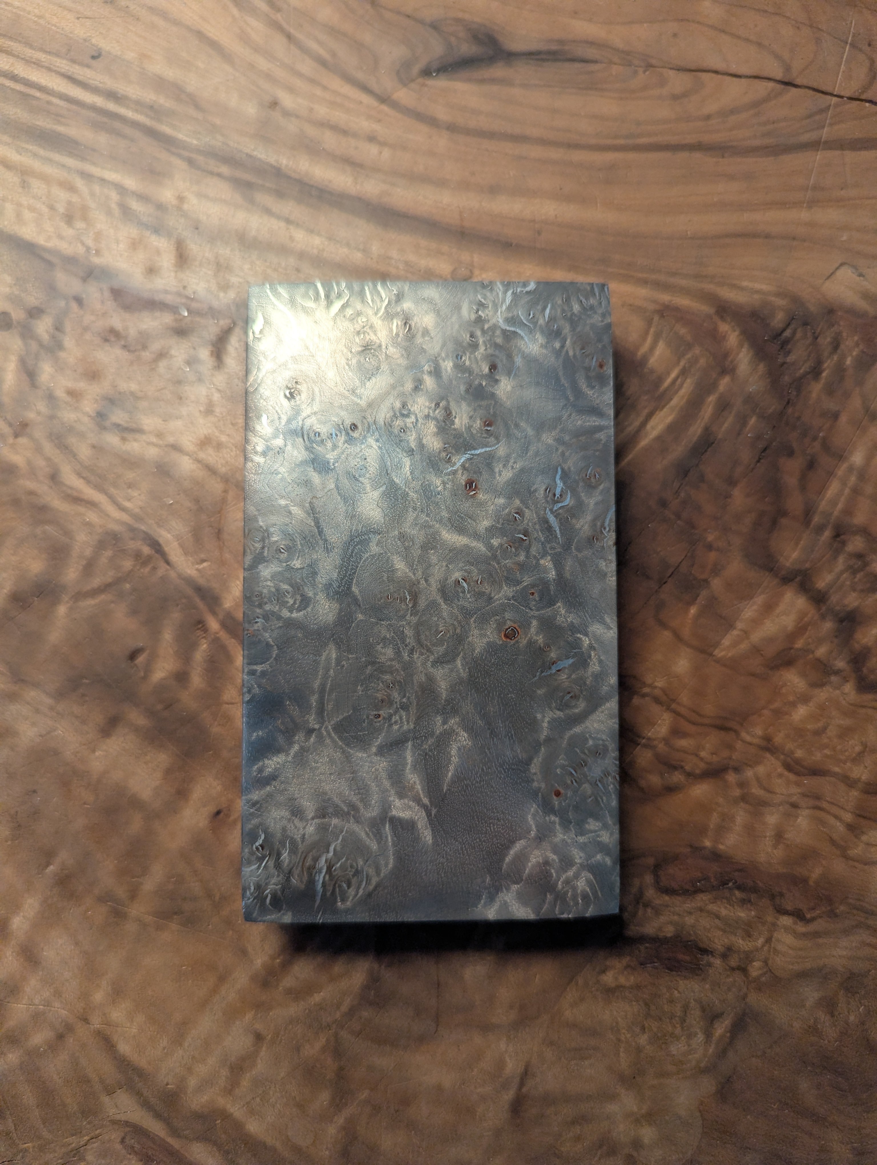 This is a material made by impregnating wood (birch) with metal. Its complex burl figure is metallically enhanced, reflecting light with a vivid, shimmering sparkle.