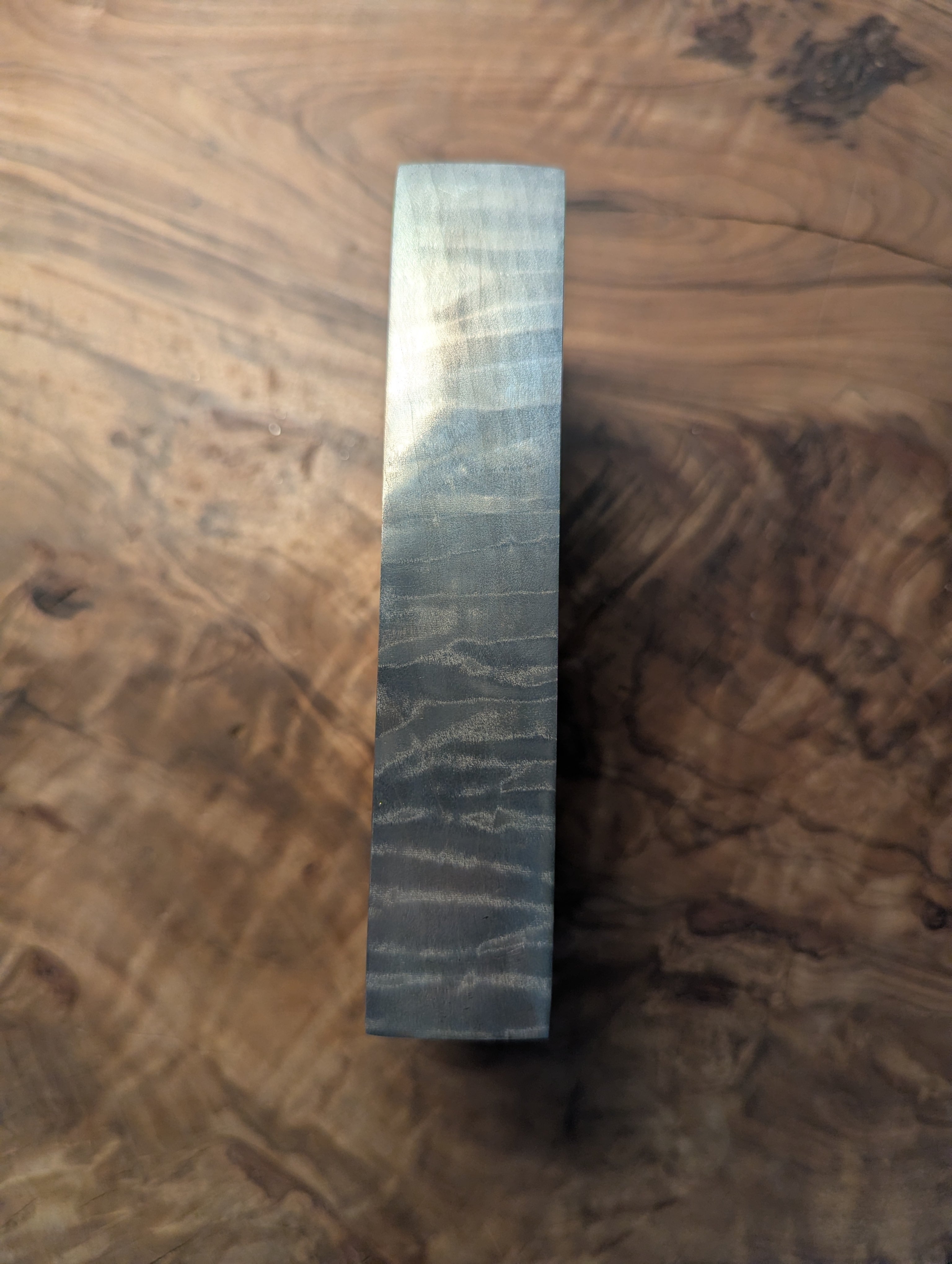 木材(トチ)に金属を含浸させた材料です。木目と杢が銀色に強調されており、光を反射してギラギラとダイナミックに輝きます。
