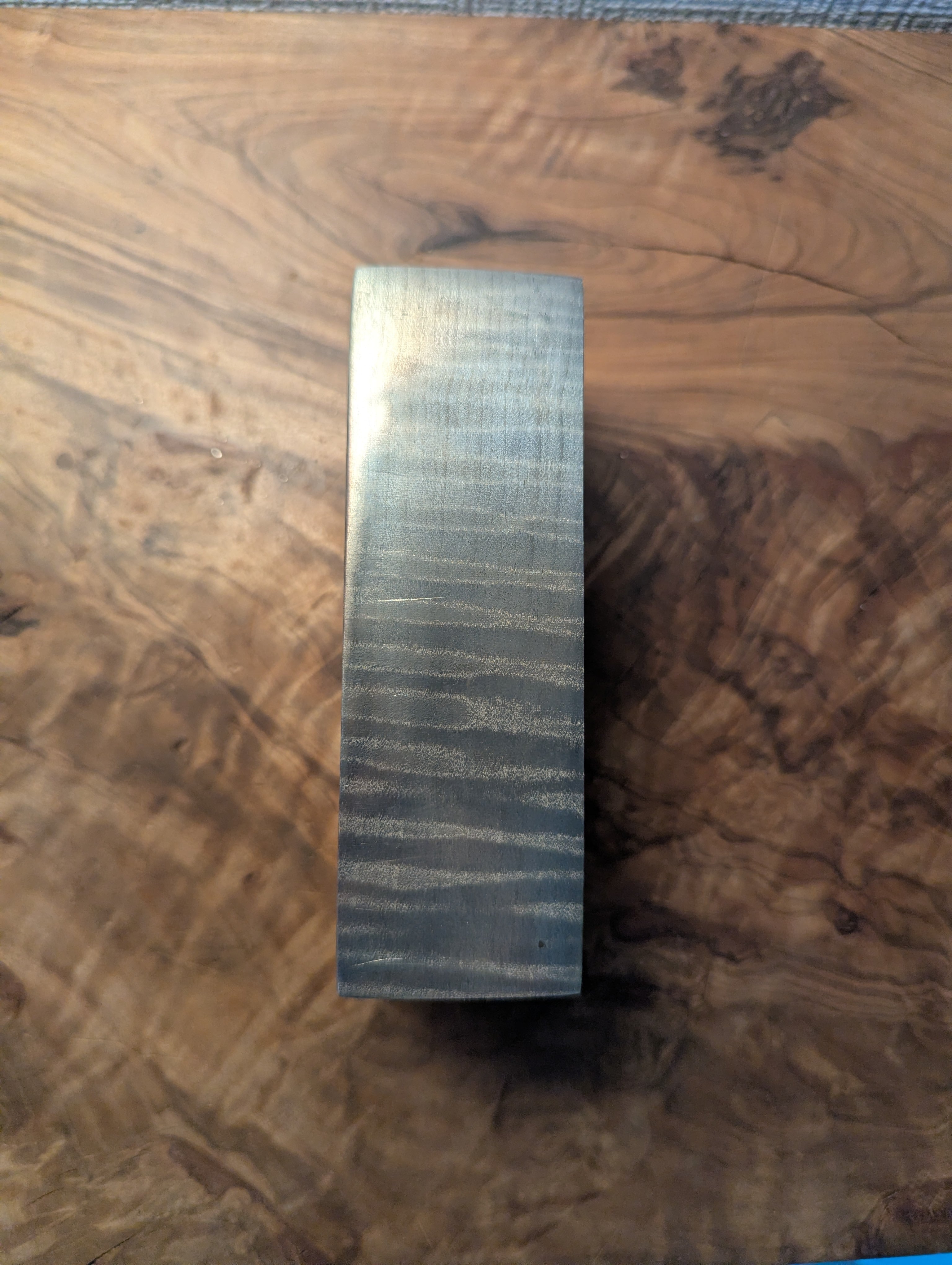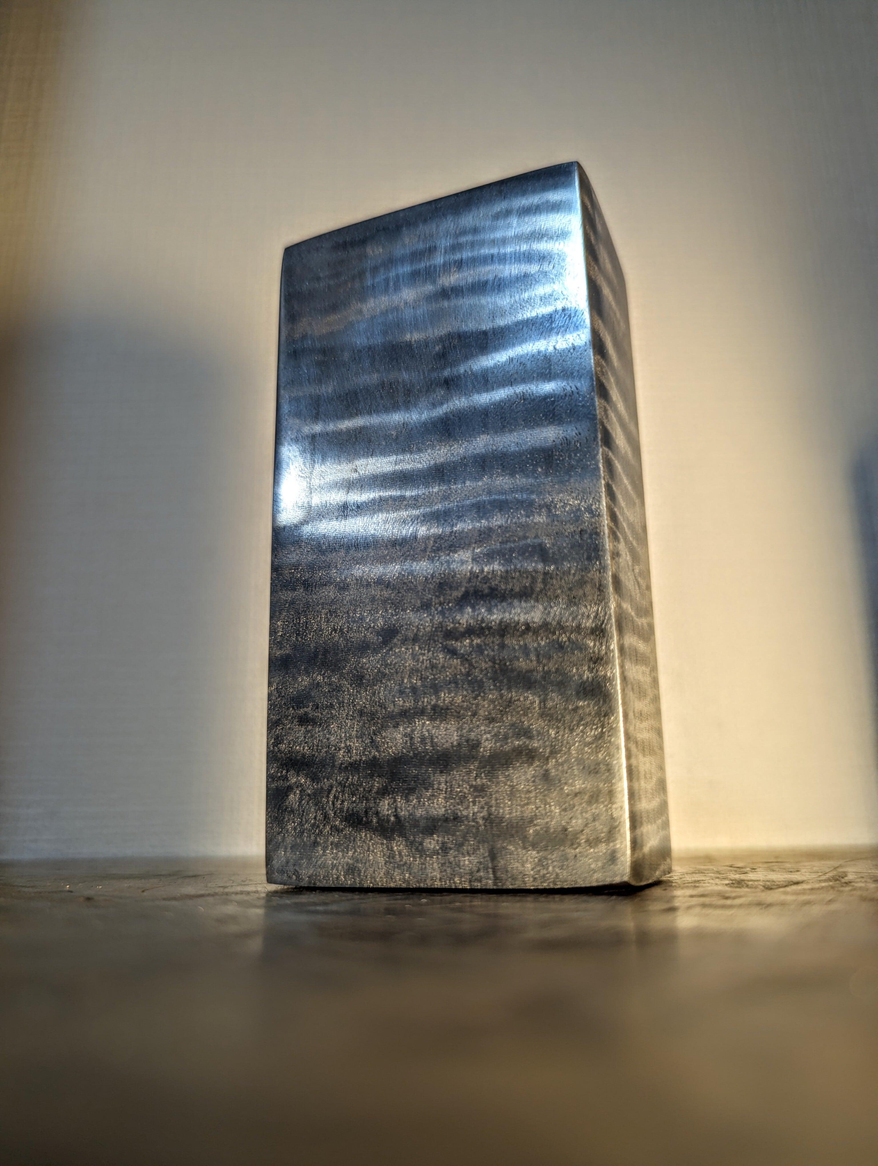 木材(トチ)に金属を含浸させた材料です。木目と縮杢が銀色に強調されており、光を反射してギラギラとダイナミックに輝きます。