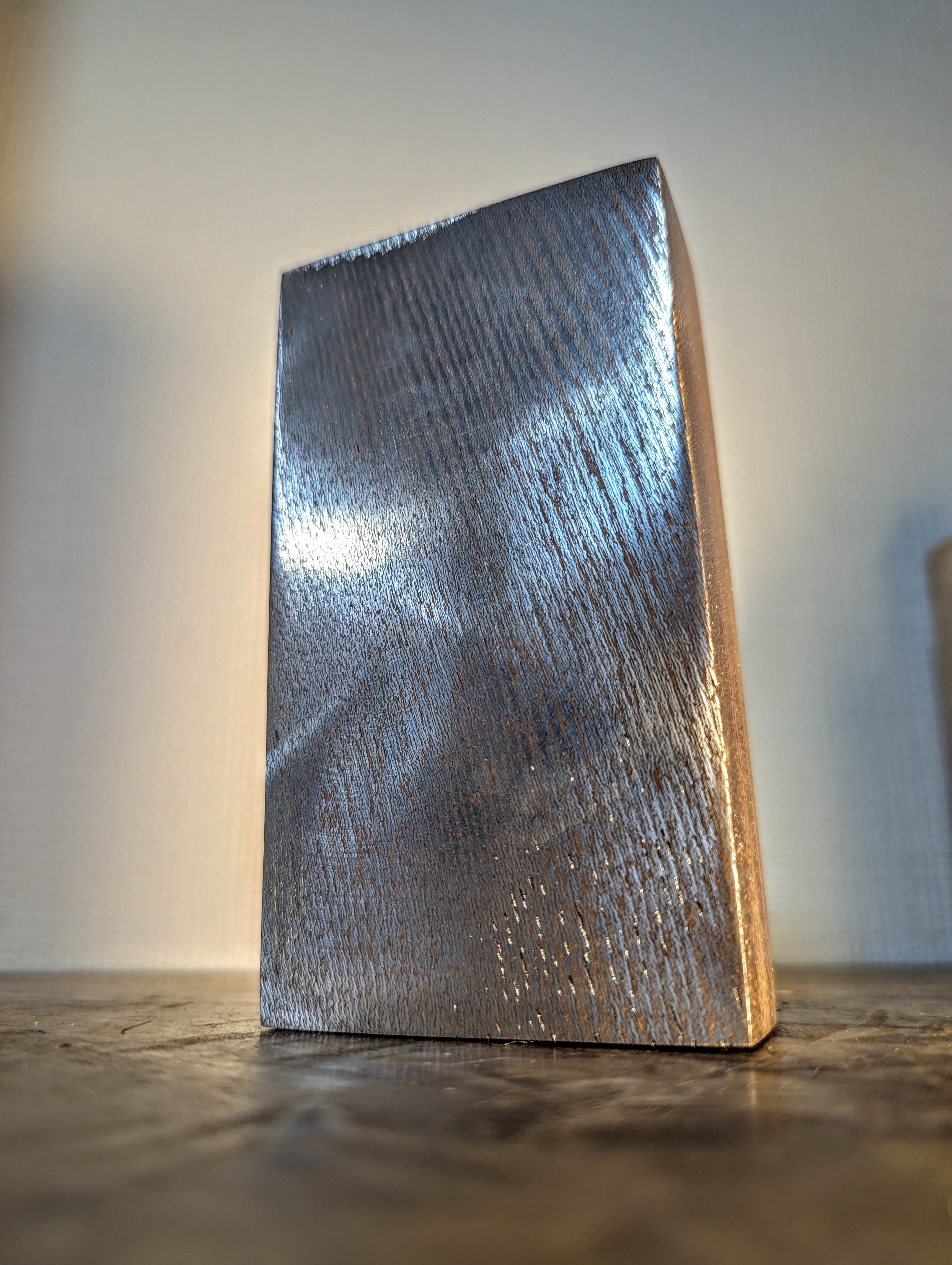木材(ケヤキ)に金属を含浸させた材料です。ケヤキ独特の木目がメタリックに強調されており、光を反射してギラギラと光ります。