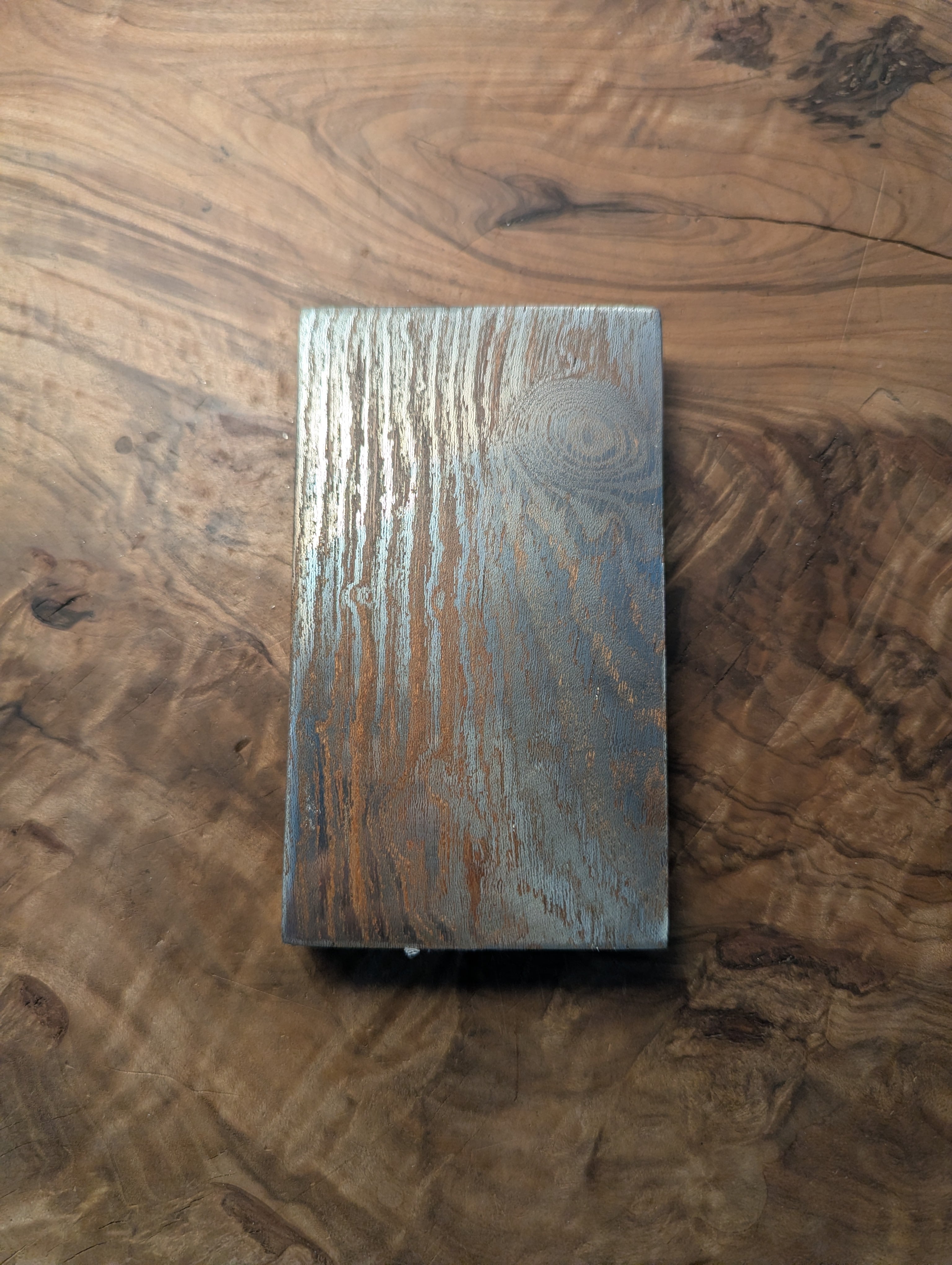 木材(ケヤキ)に金属を含浸させた材料です。ケヤキ独特の木目がメタリックに強調されており、光を反射してギラギラと光ります。