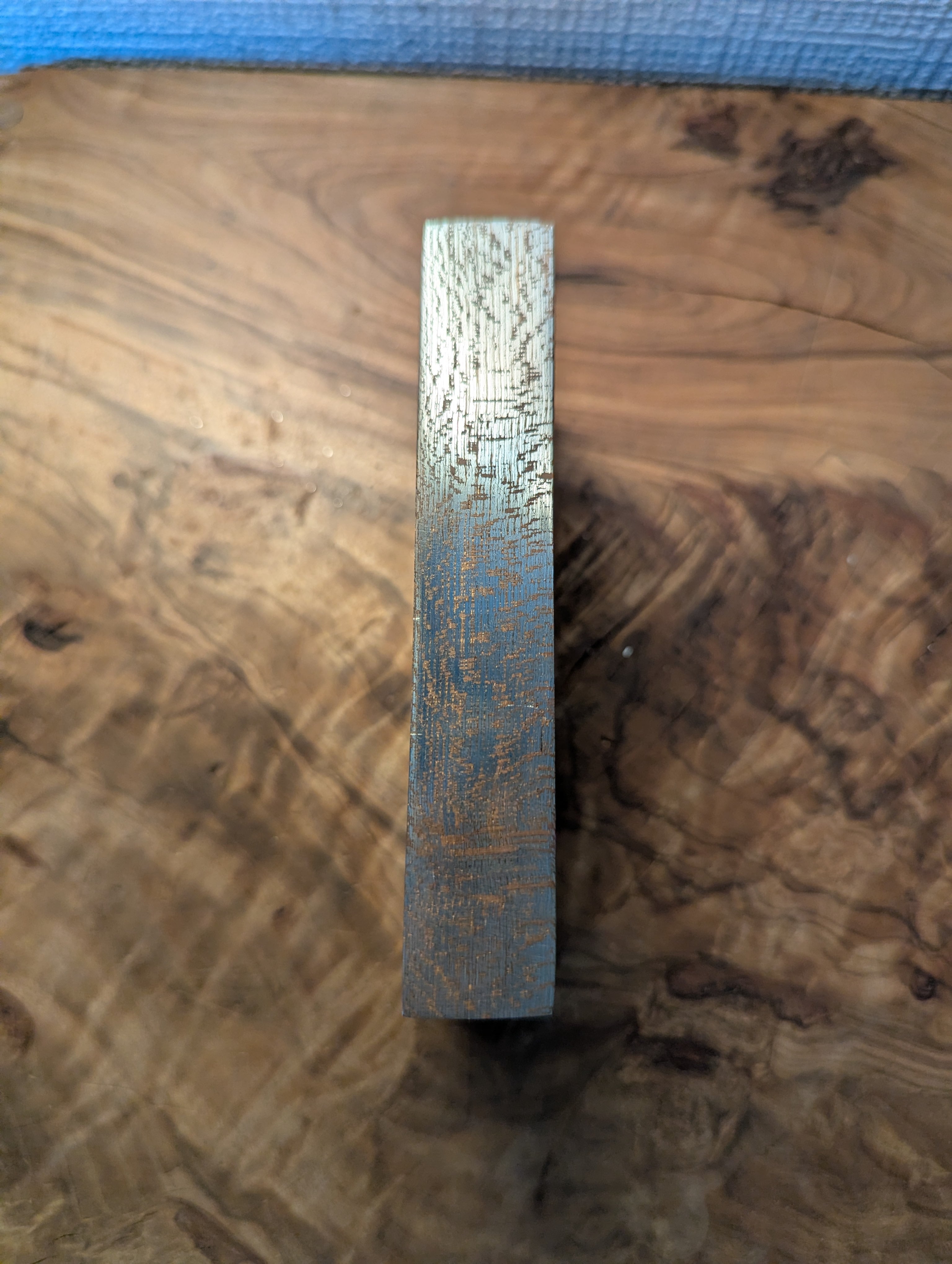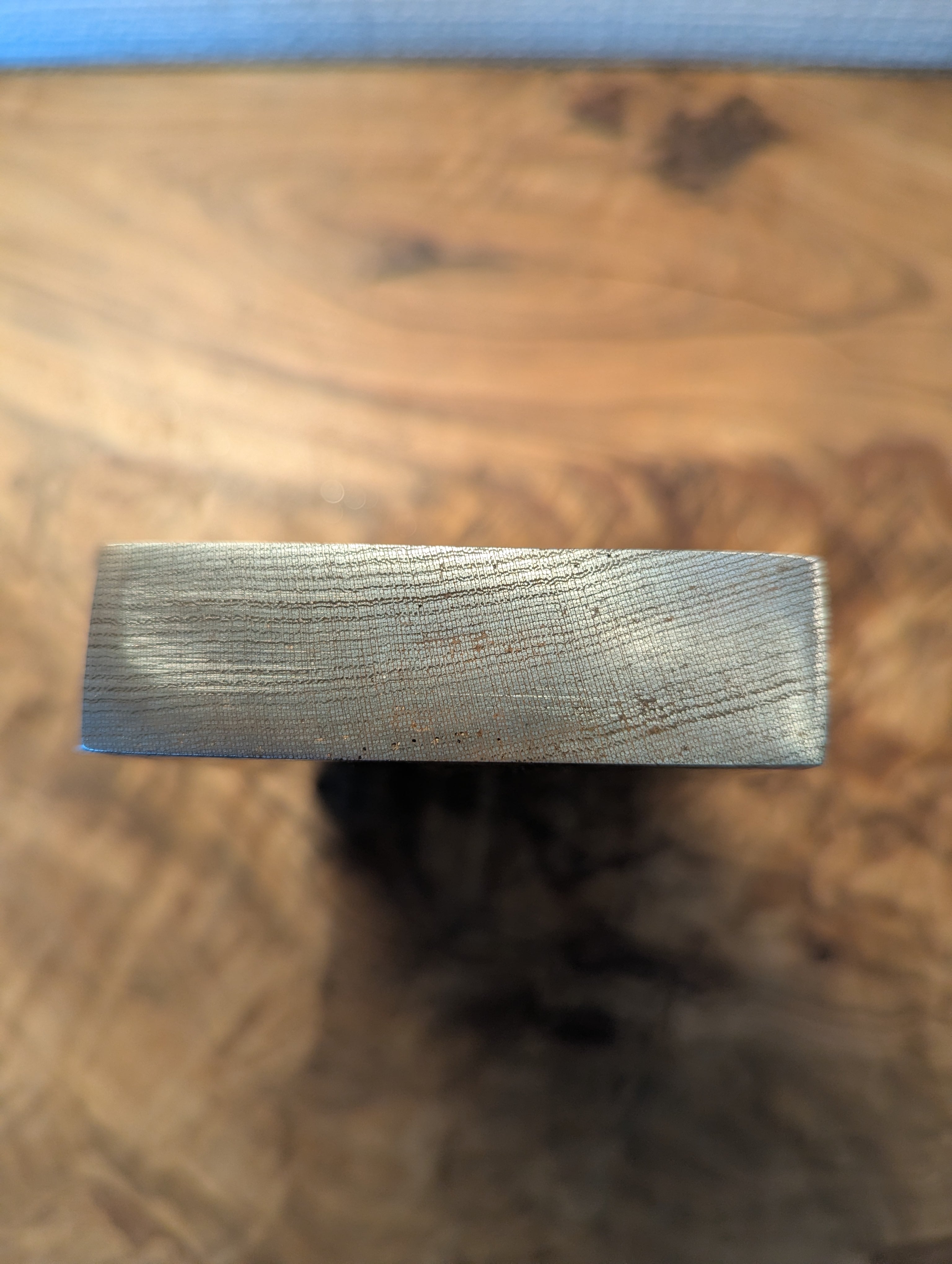 木材(ケヤキ)に金属を含浸させた材料です。ケヤキ独特の木目がメタリックに強調されており、光を反射してギラギラと光ります。