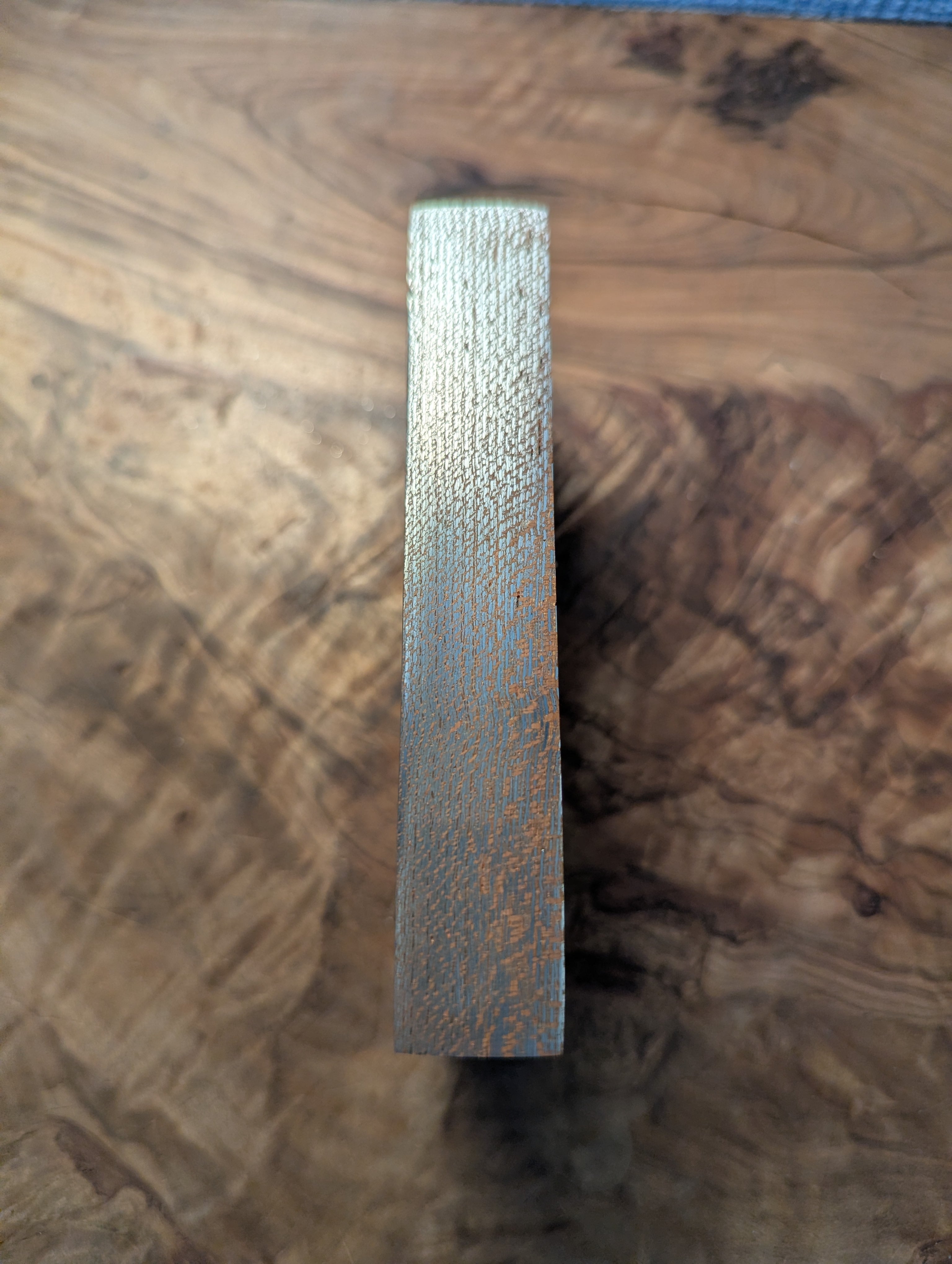 木材(ケヤキ)に金属を含浸させた材料です。ケヤキ独特の木目がメタリックに強調されており、光を反射してギラギラと光ります。