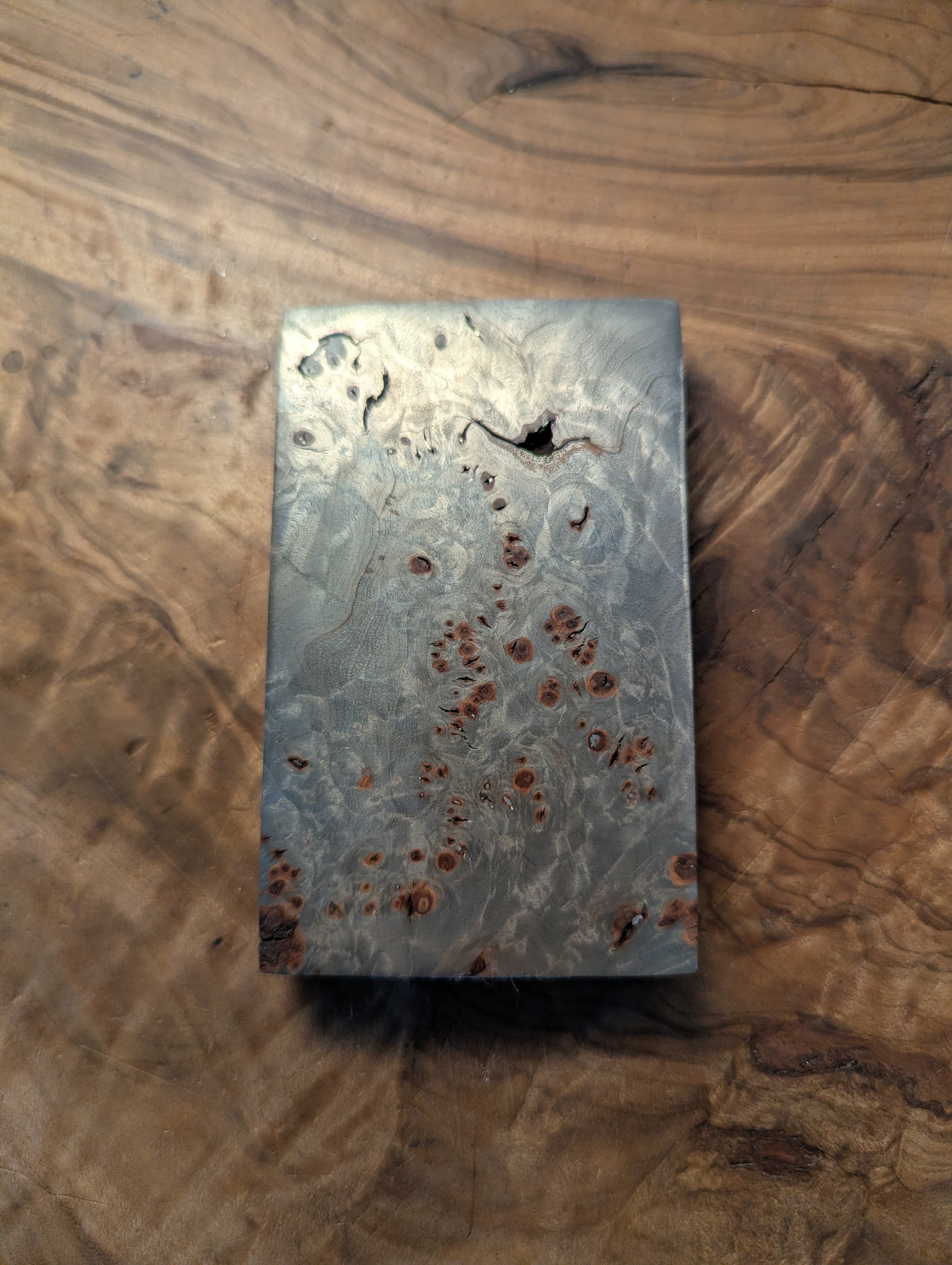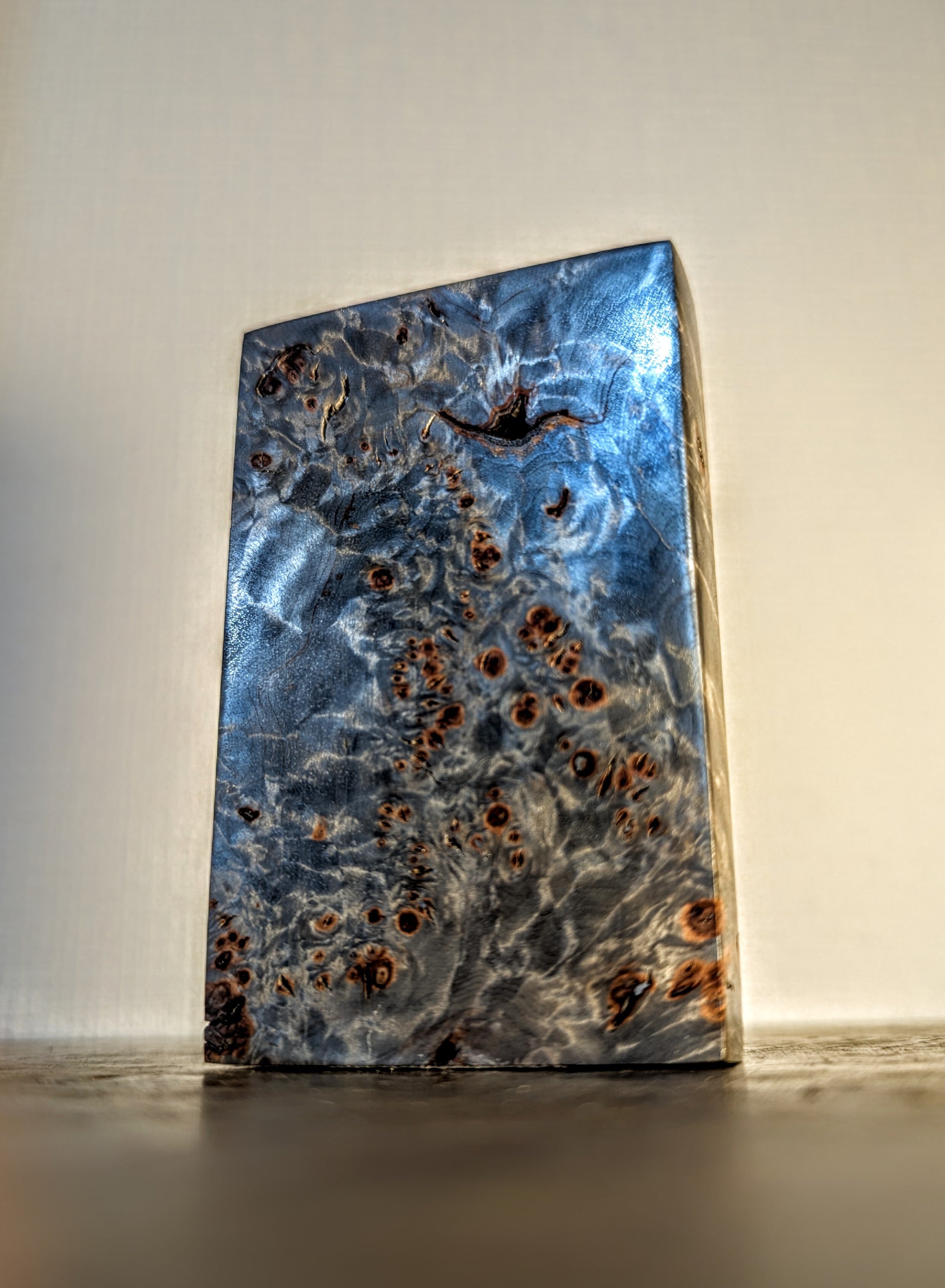 This is a material made by impregnating wood (birch) with metal. Its complex burl figure is metallically enhanced, reflecting light with a vivid, shimmering sparkle.