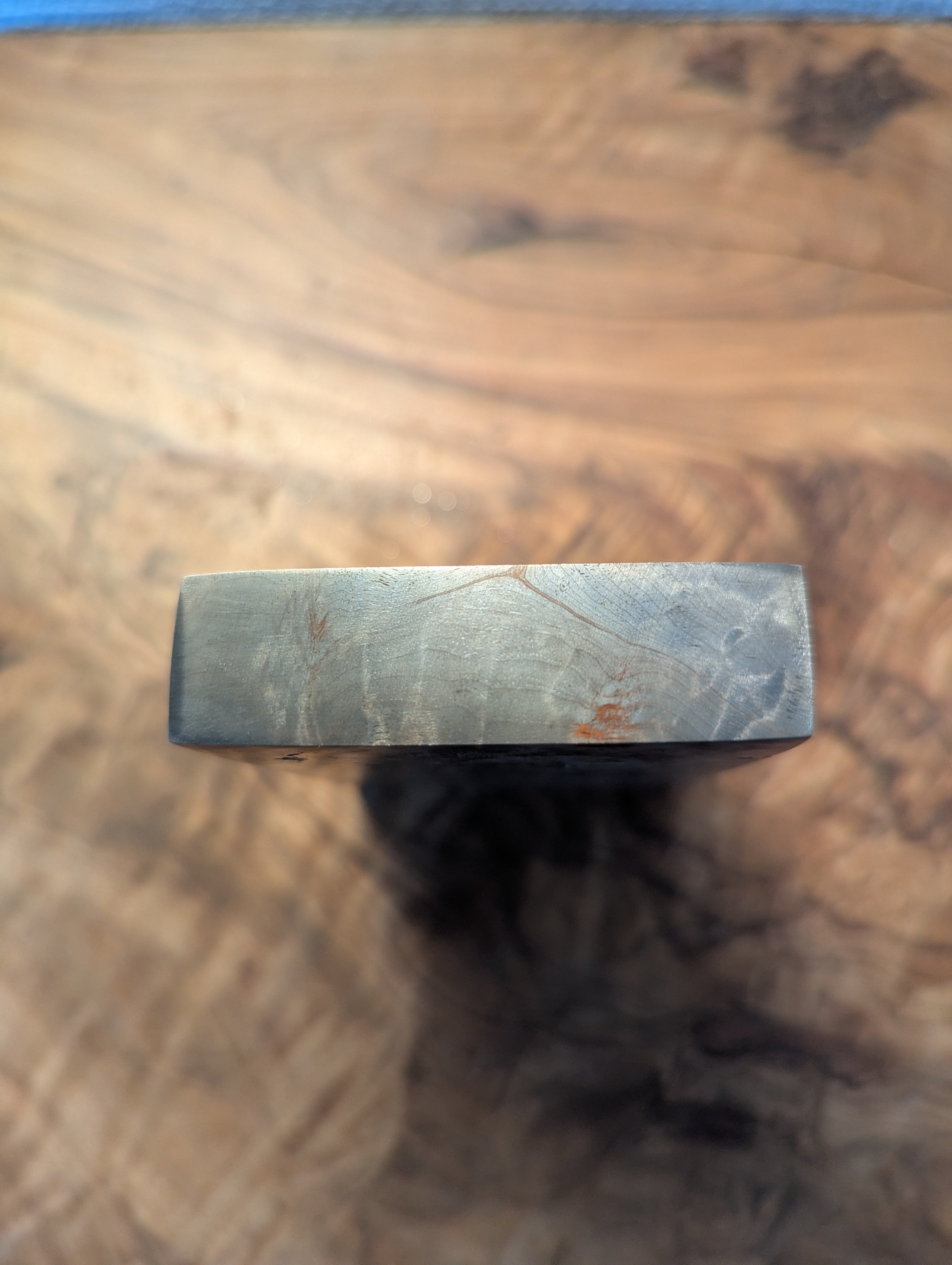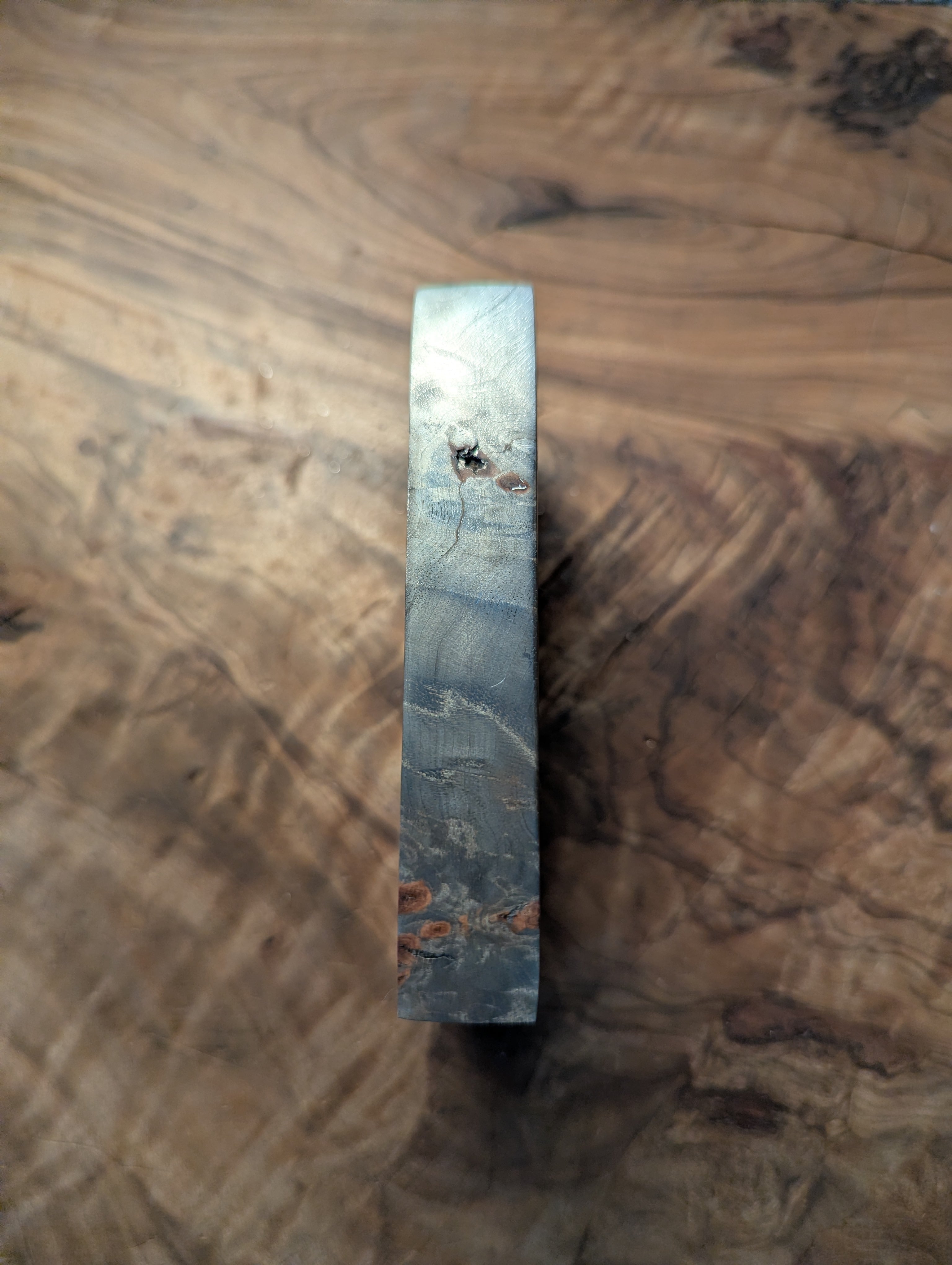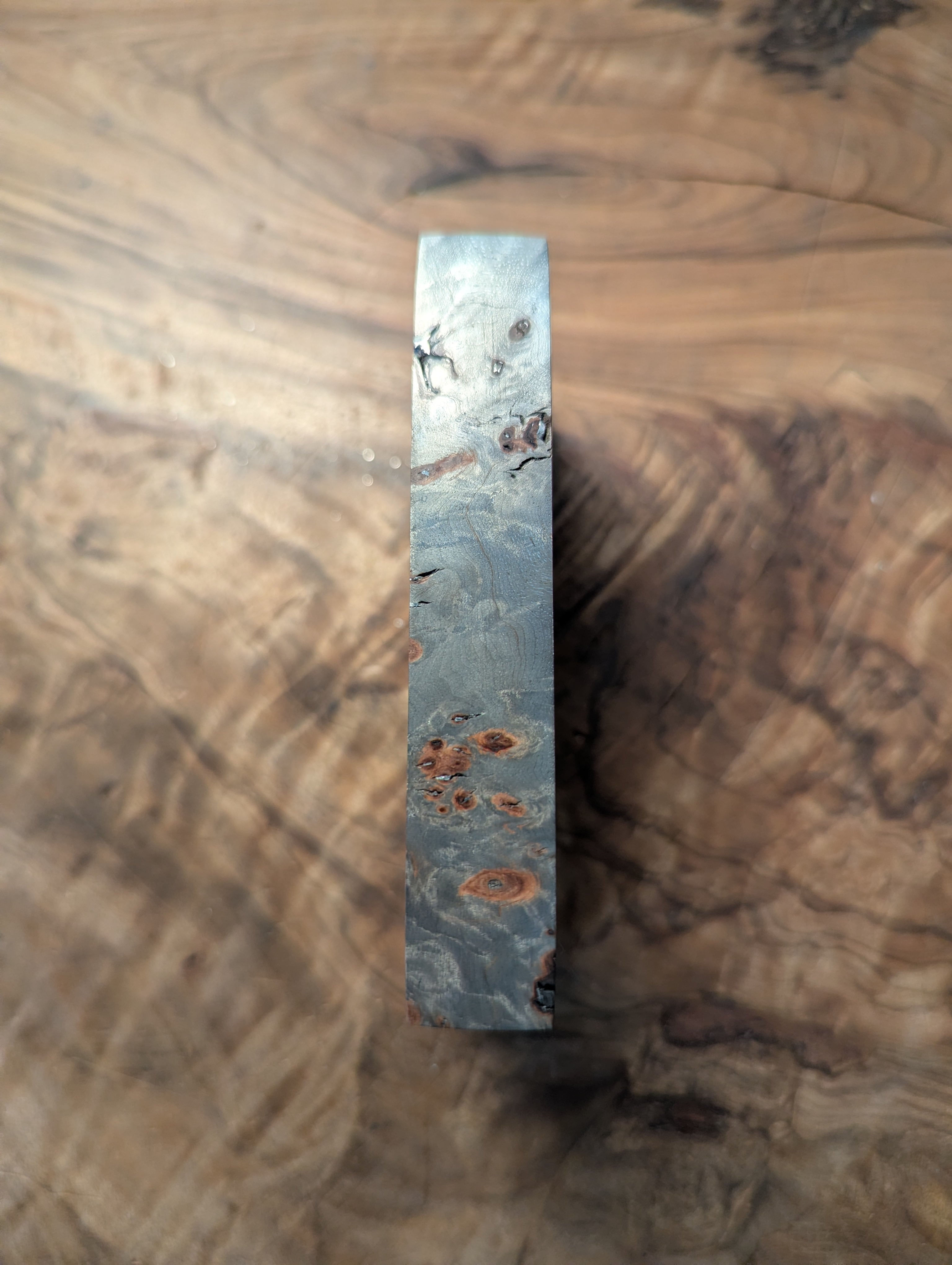 木材(カバ)に金属を含浸させた材料です。複雑な瘤杢がメタリックに強調されており、光を反射してギラギラと光ります。