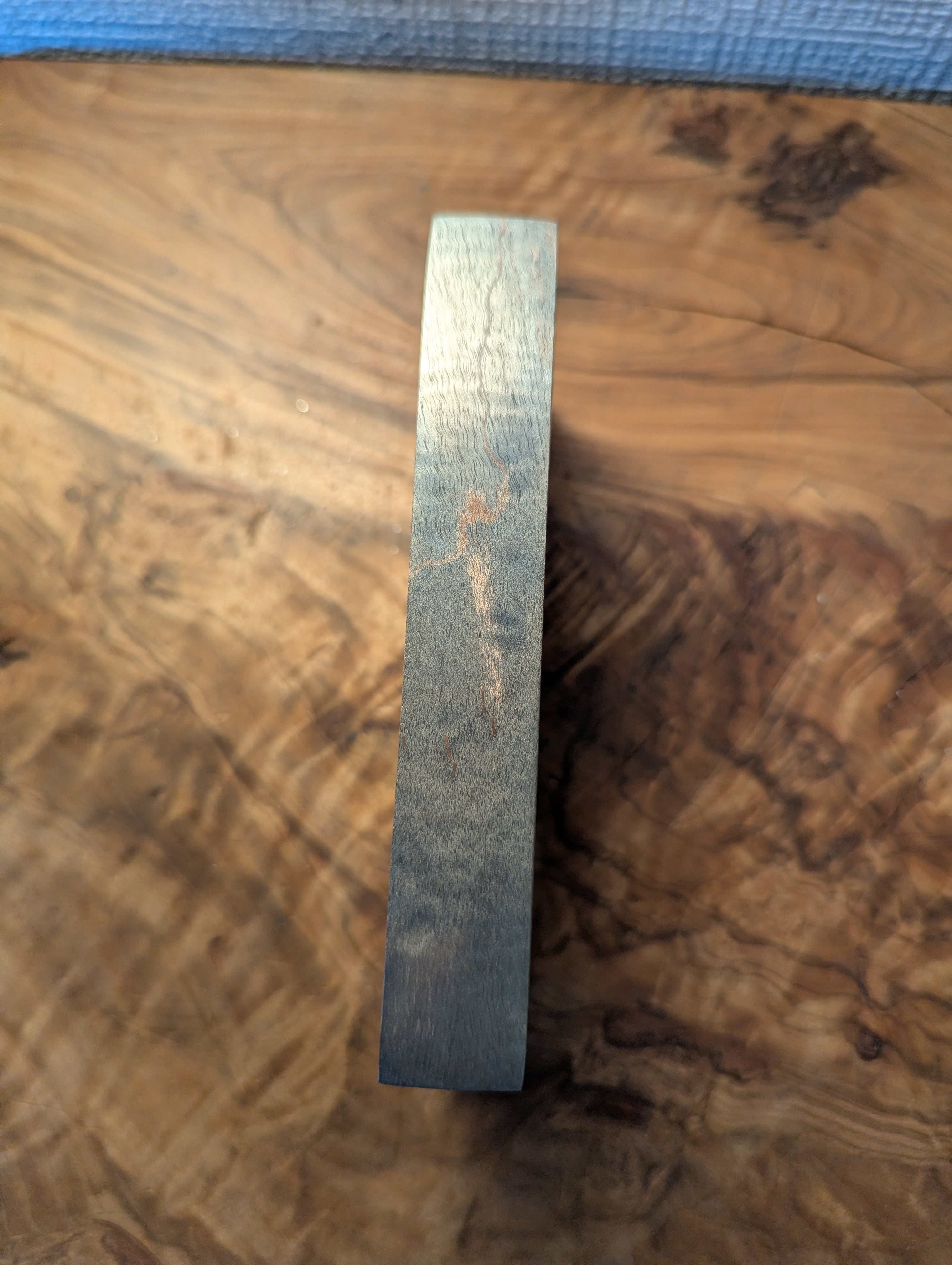 木材(メープル)に金属を含浸させた材料です。木目と縮杢がメタリックに強調されており、光を反射してギラギラと光ります。