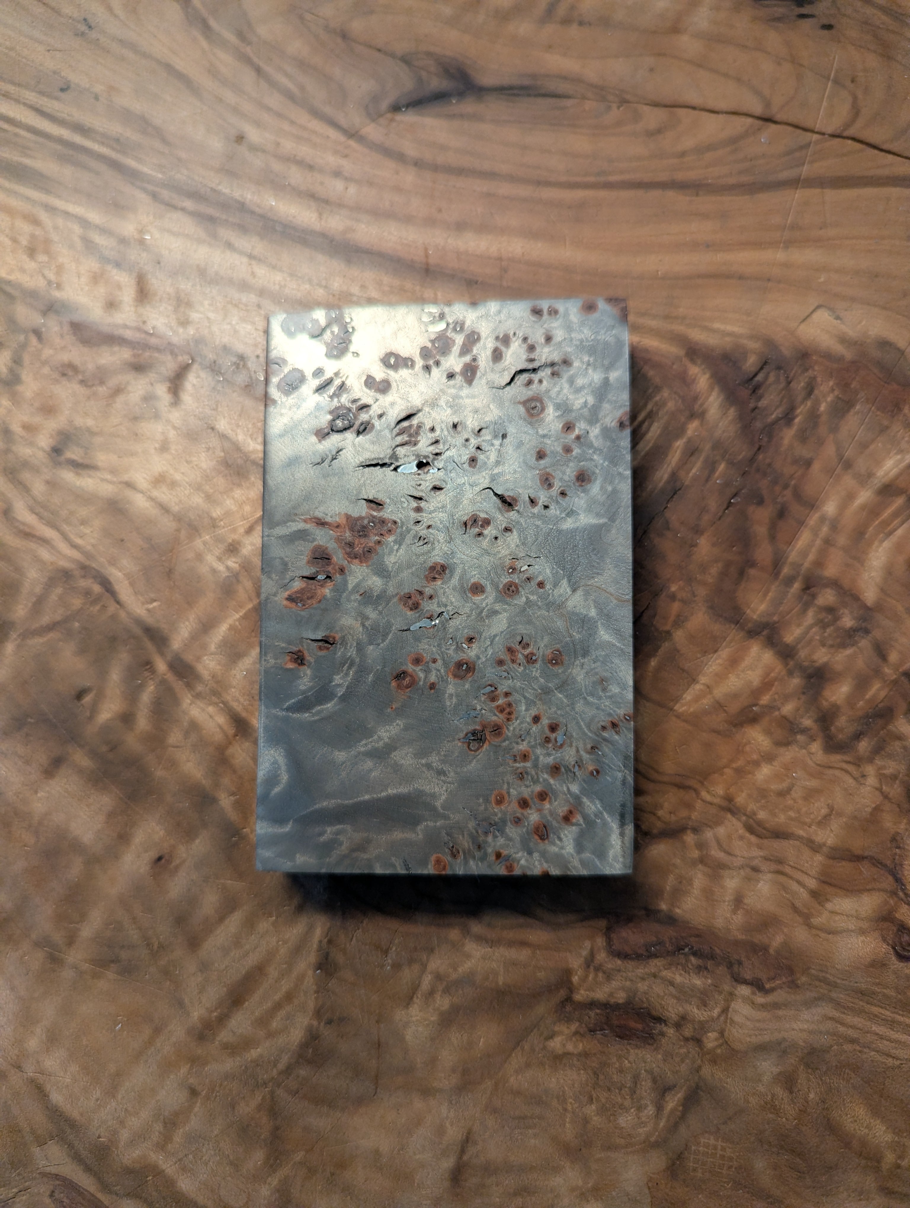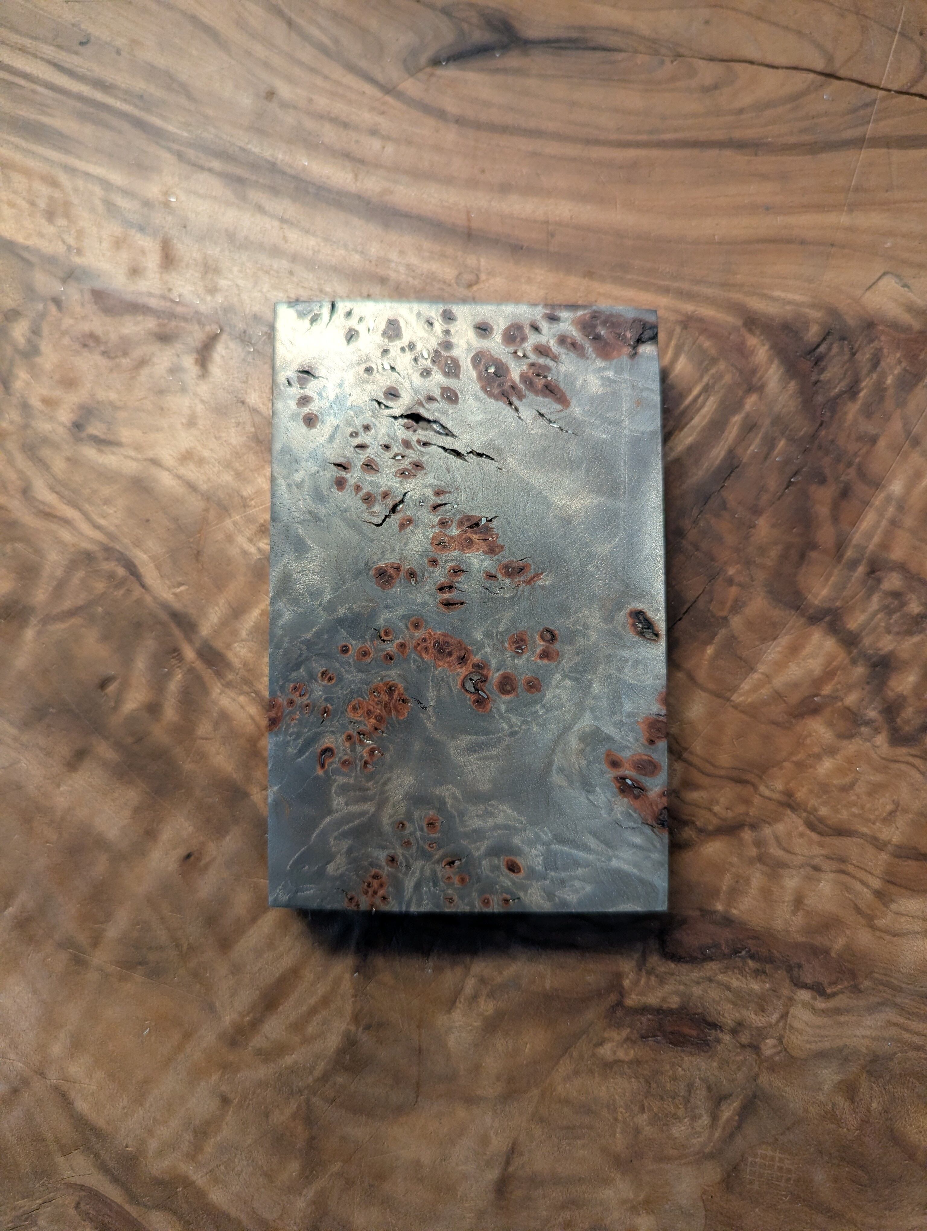 This is a material made by impregnating wood (birch) with metal. Its complex burl figure is metallically enhanced, reflecting light with a vivid, shimmering sparkle.