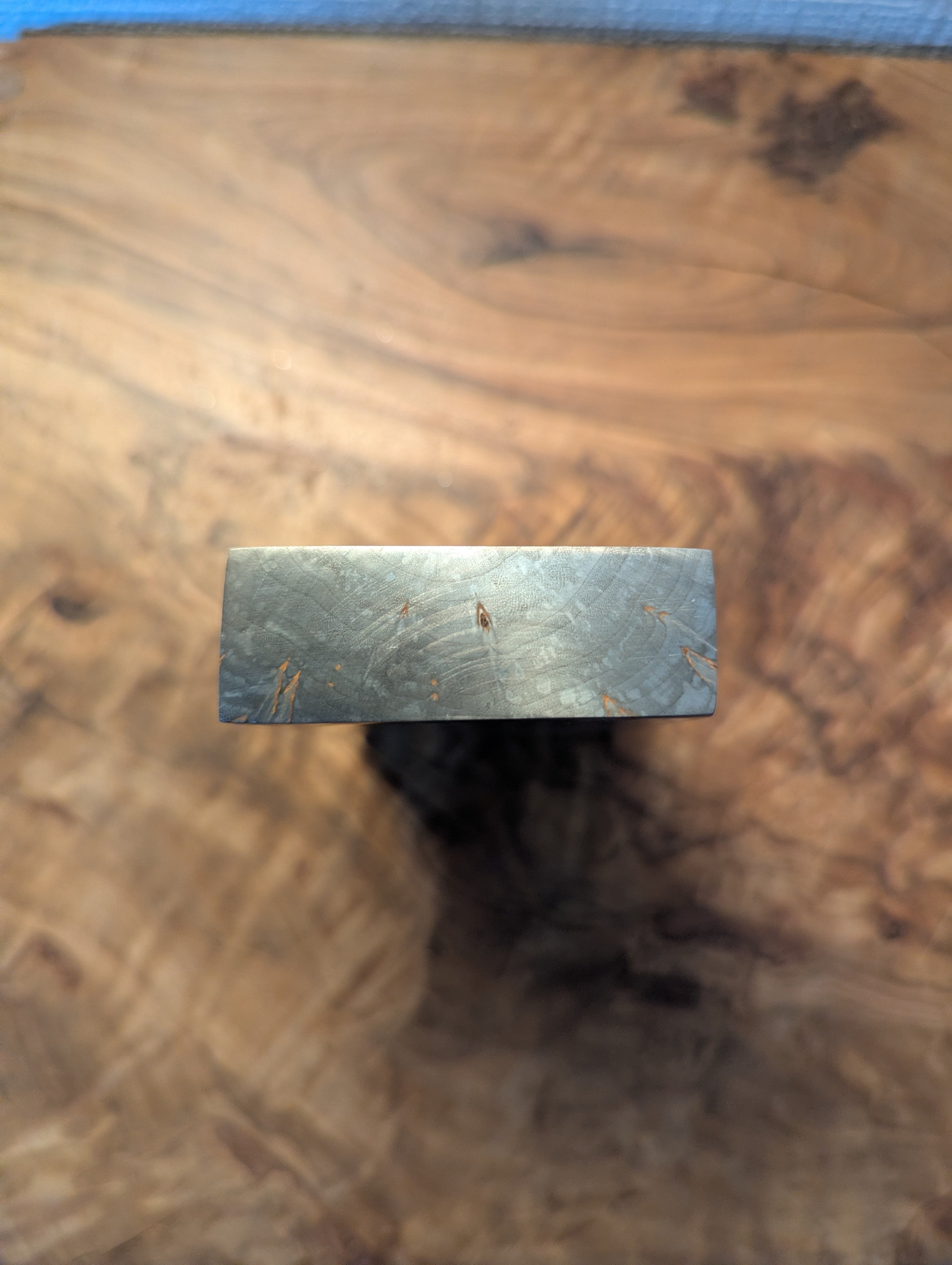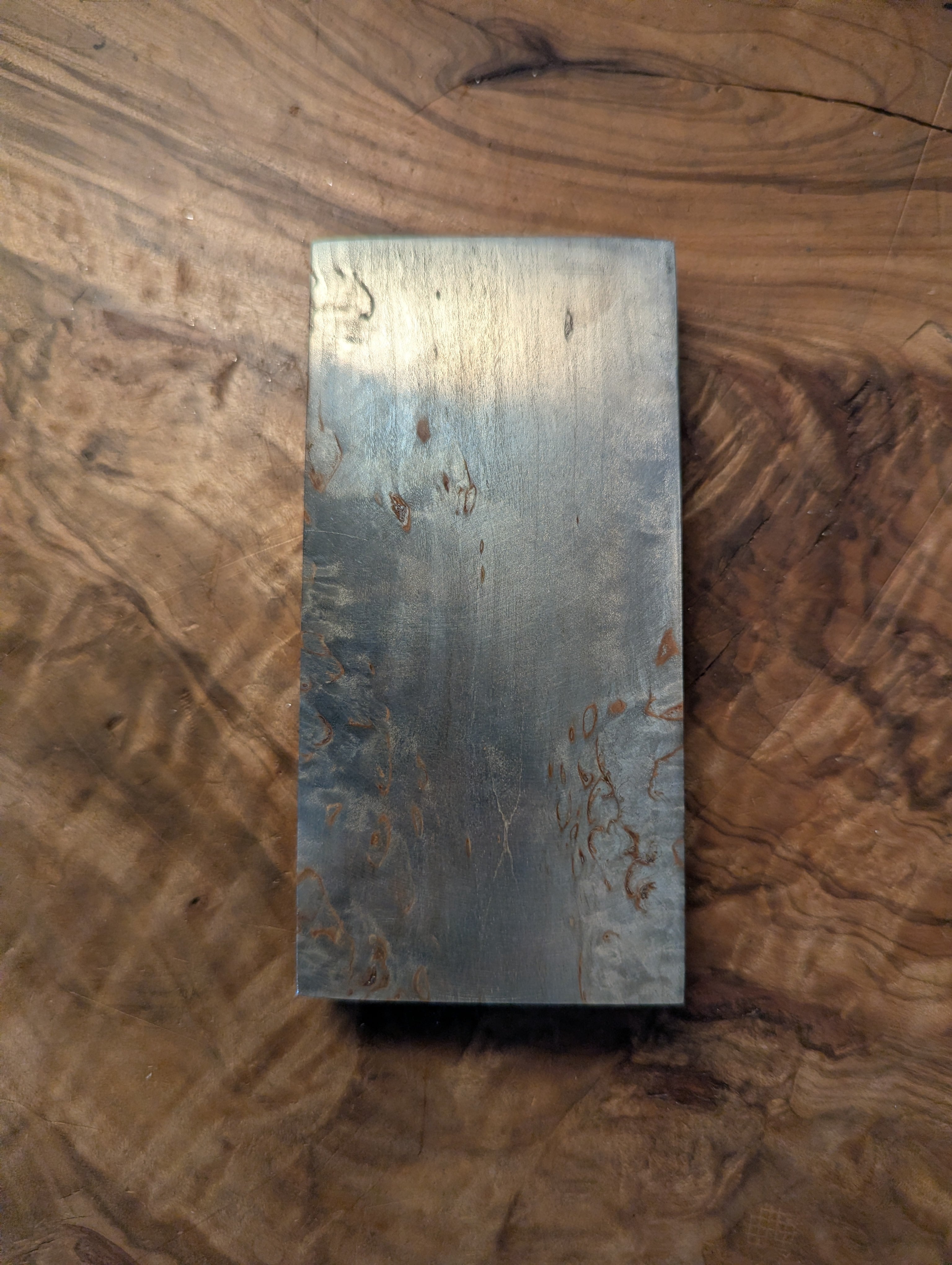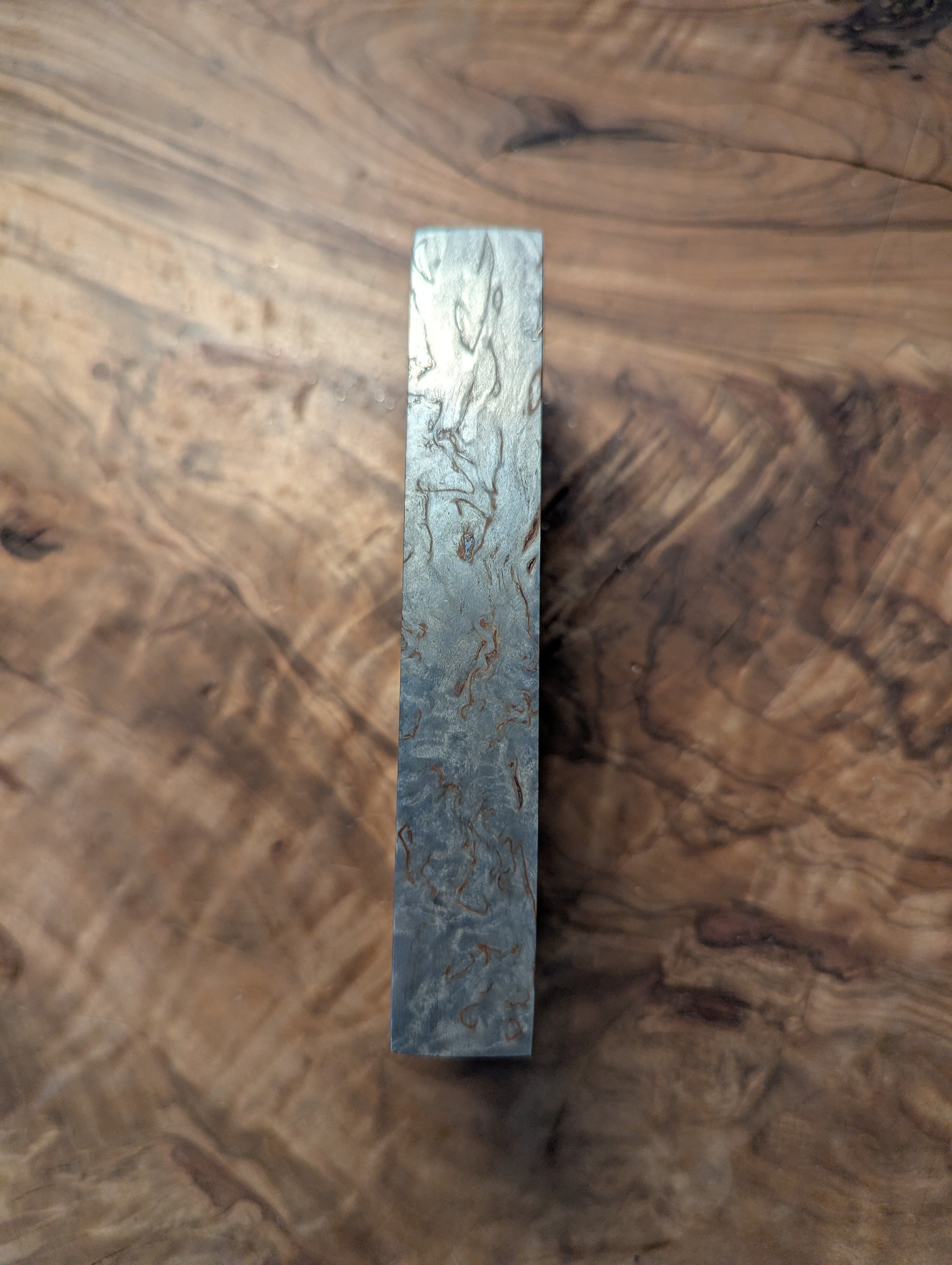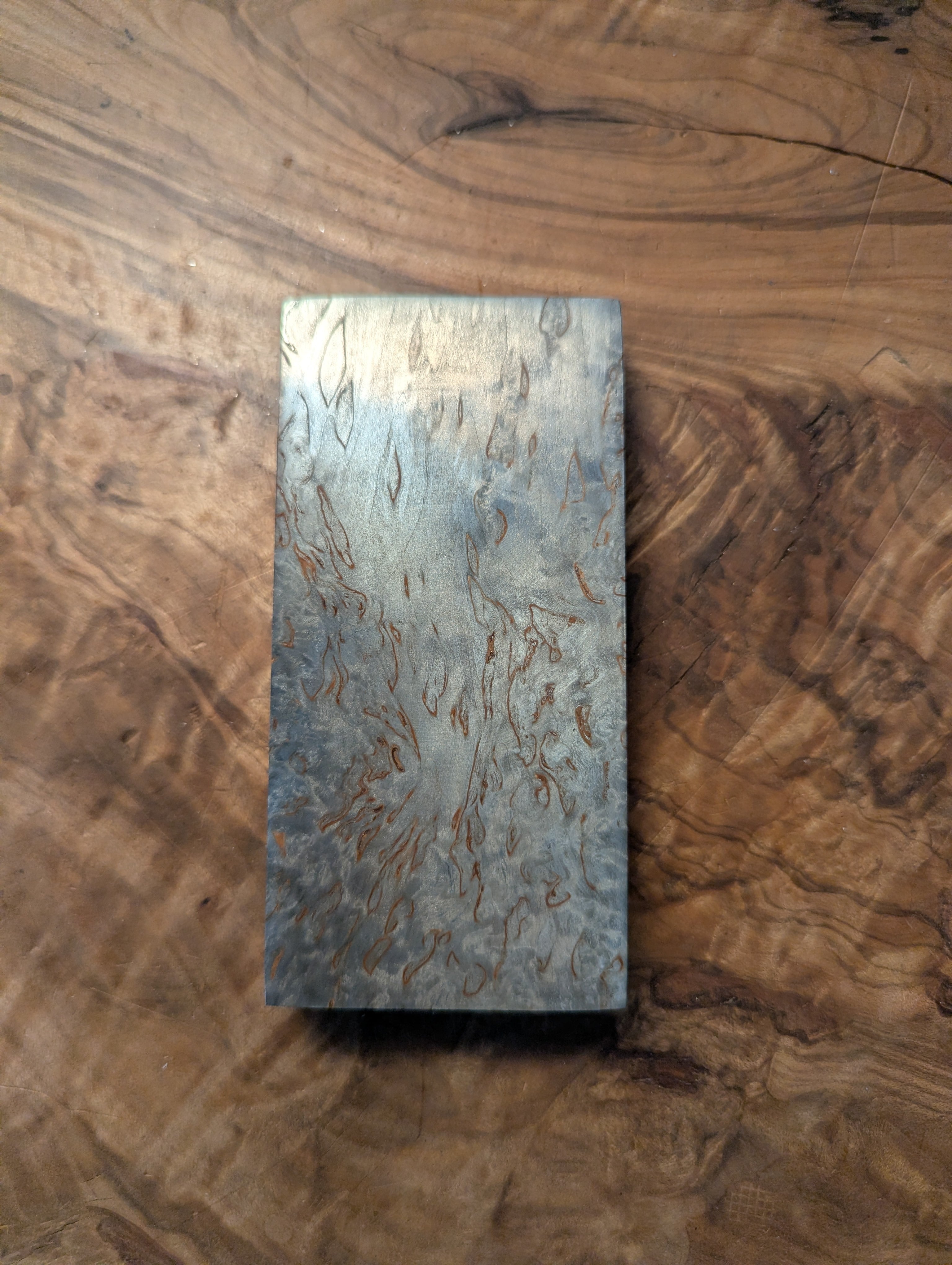 木材(カレリアンバーチ)に金属を含浸させた材料です。複雑な杢がメタリックに強調されており、角度に応じて銀の炎のようにメラメラと輝きます。