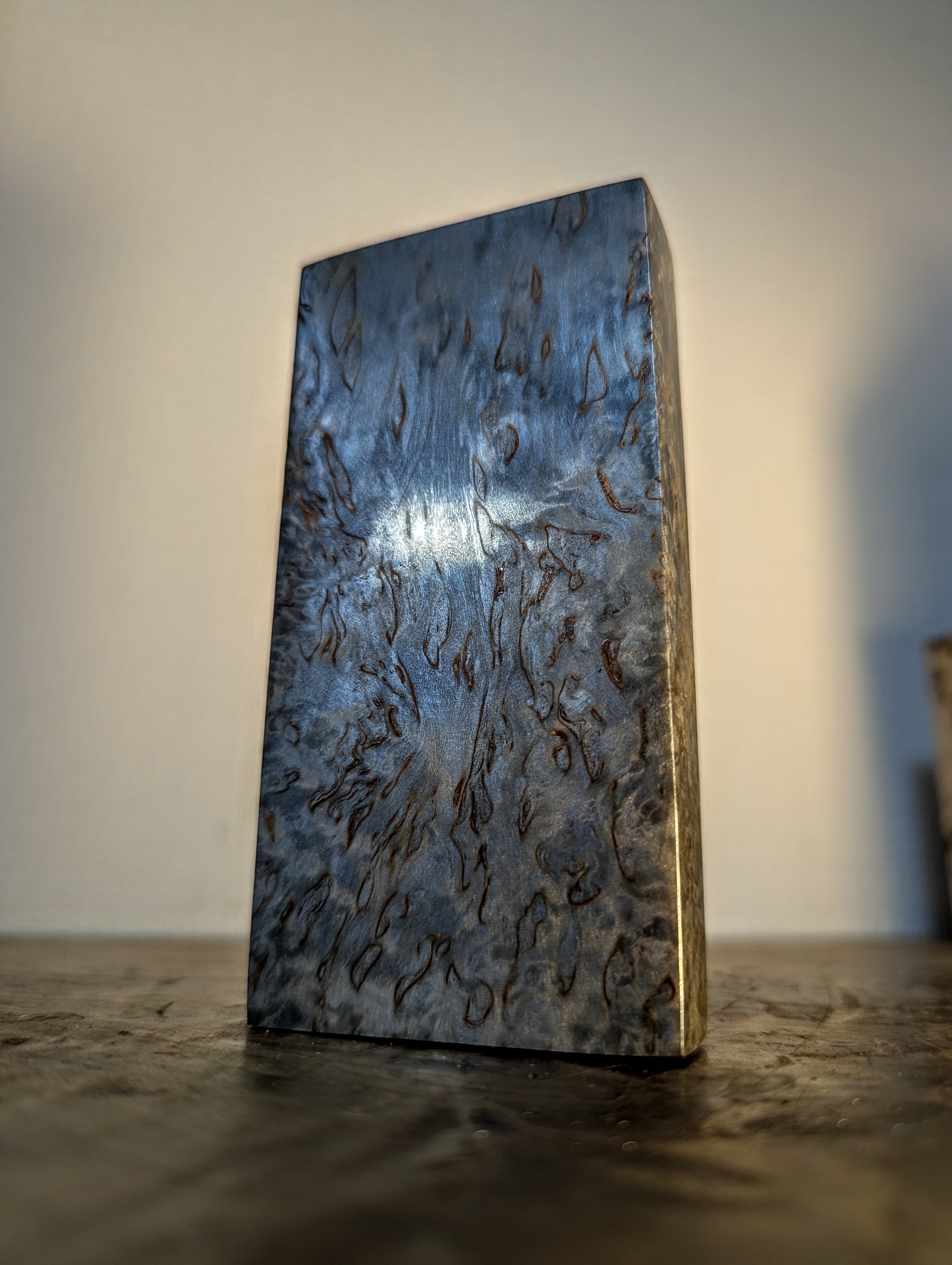 This is a material made by impregnating wood (Karelian birch) with metal. Its intricate figure is metallically enhanced, shimmering like silver flames that flicker and shift with the viewing angle.