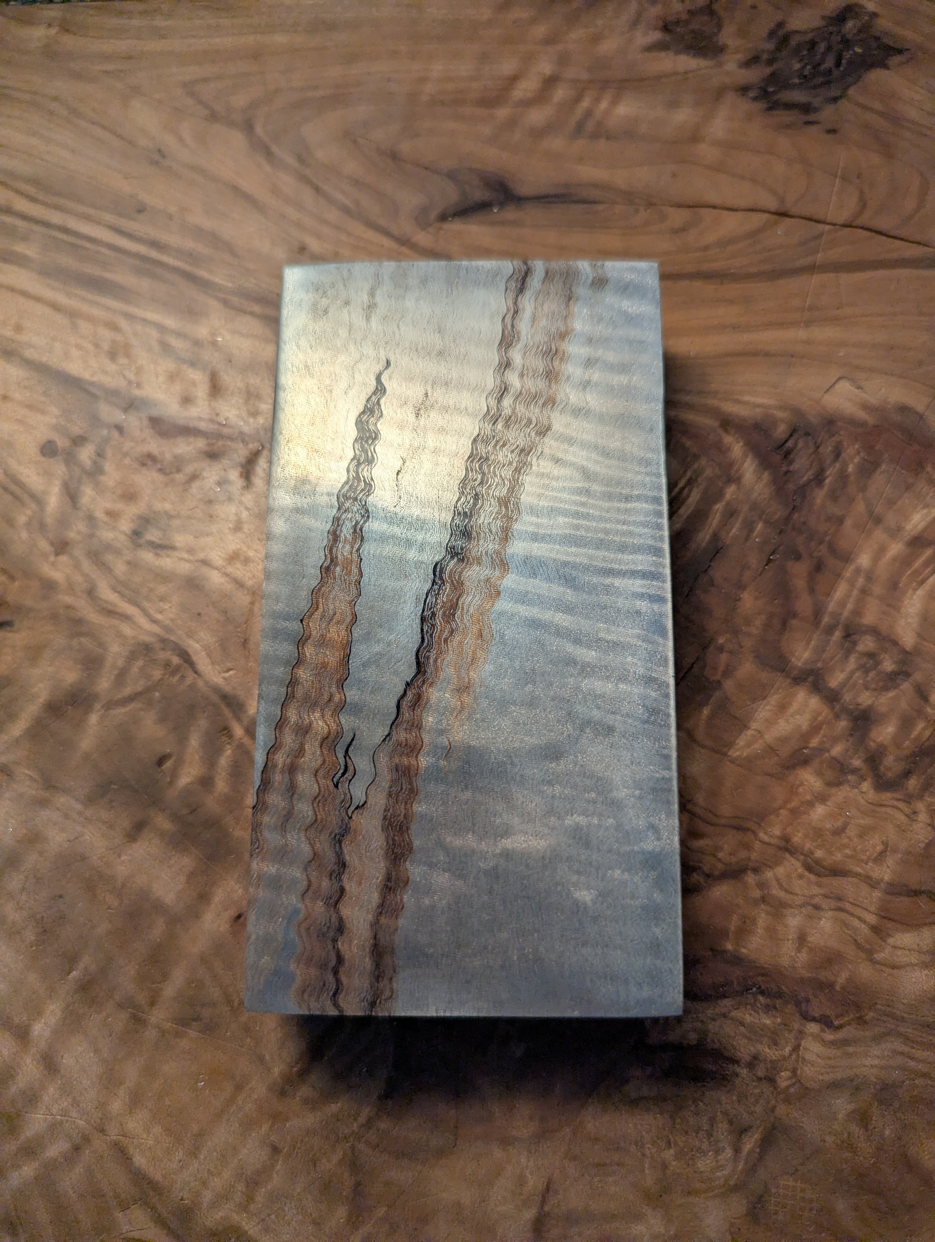 木材(トチ)に金属を含浸させた材料です。木目と縮杢が銀色に強調されており、光を反射してギラギラとダイナミックに輝きます。