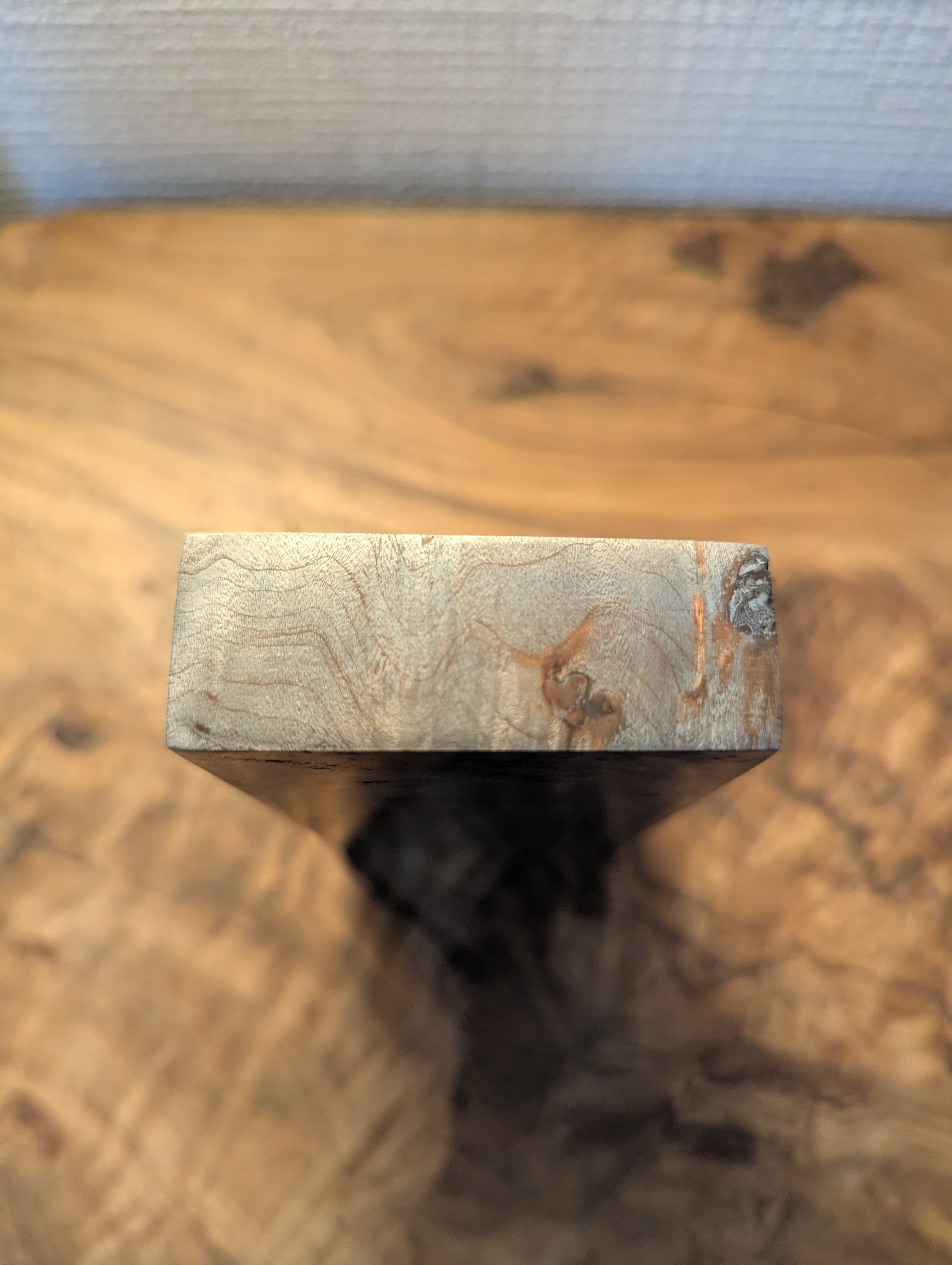 木材(メープル)に金属を含浸させた材料です。複雑な瘤杢がメタリックに強調されており、光を反射してギラギラと光ります。