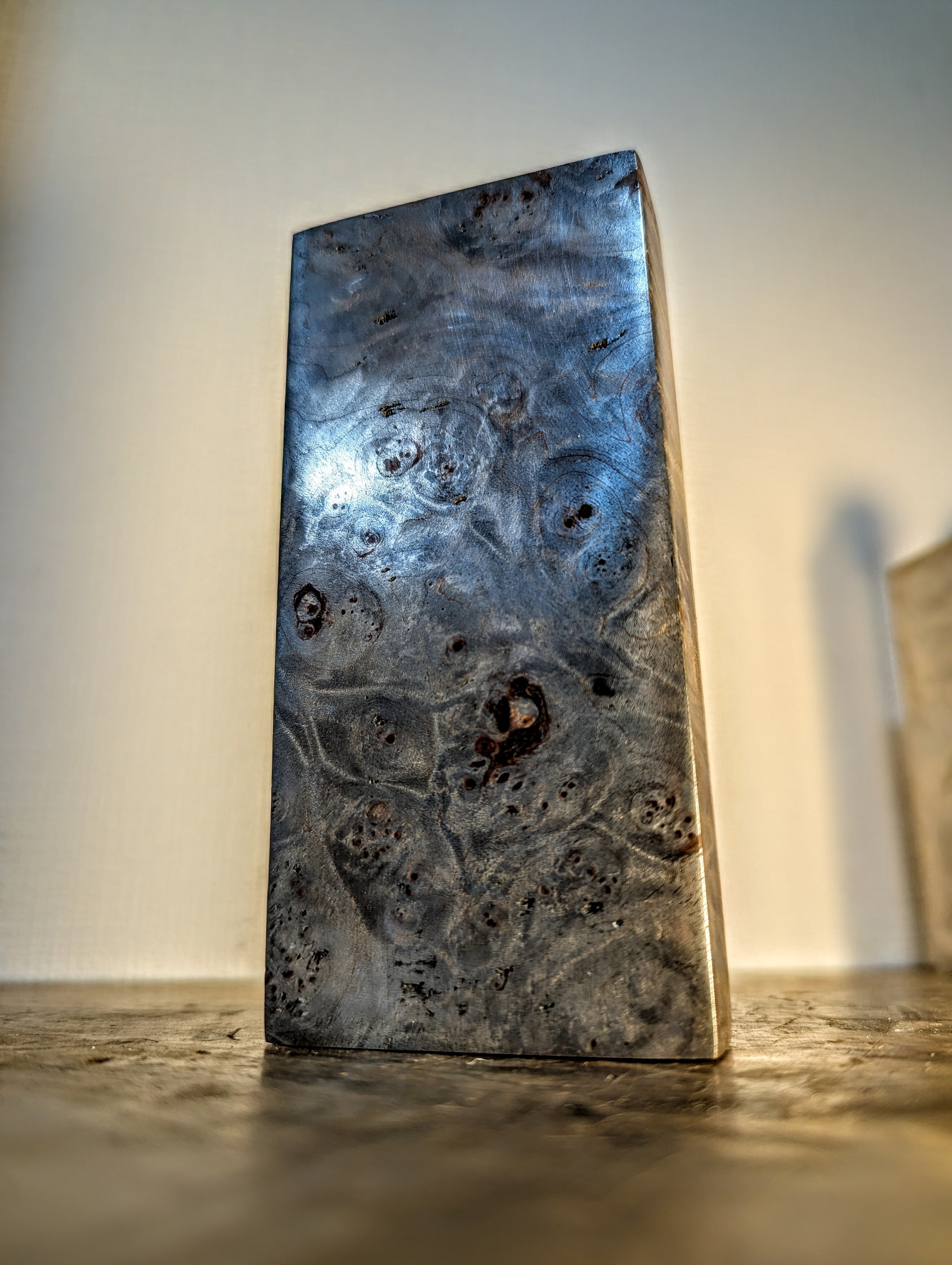 This is a material made by impregnating wood (maple) with metal. Its complex burl figure is metallically enhanced, reflecting light with a vivid, shimmering sparkle.