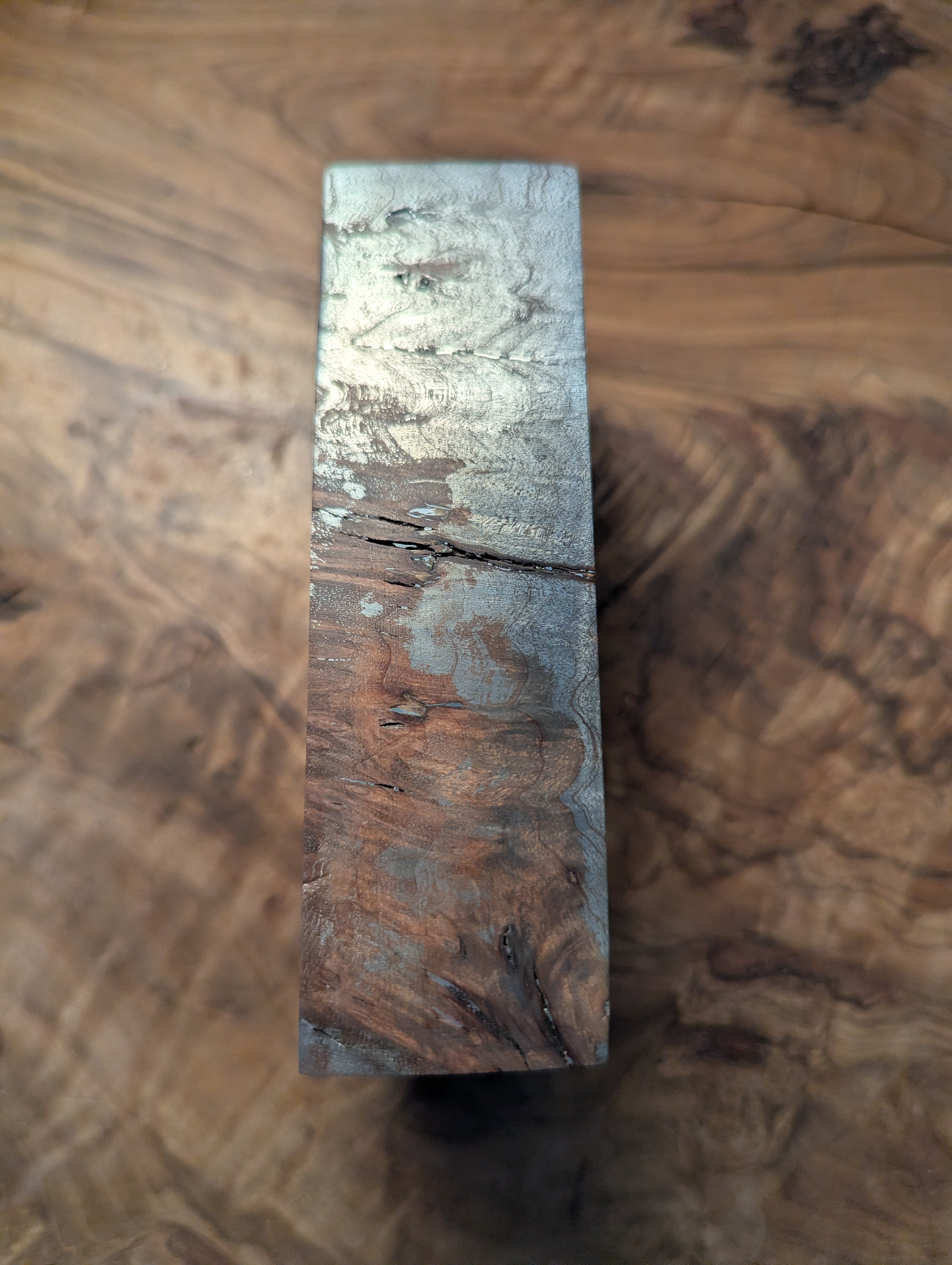 木材(メープル)に金属を含浸させた材料です。複雑な瘤杢がメタリックに強調されており、光を反射してギラギラと光ります。