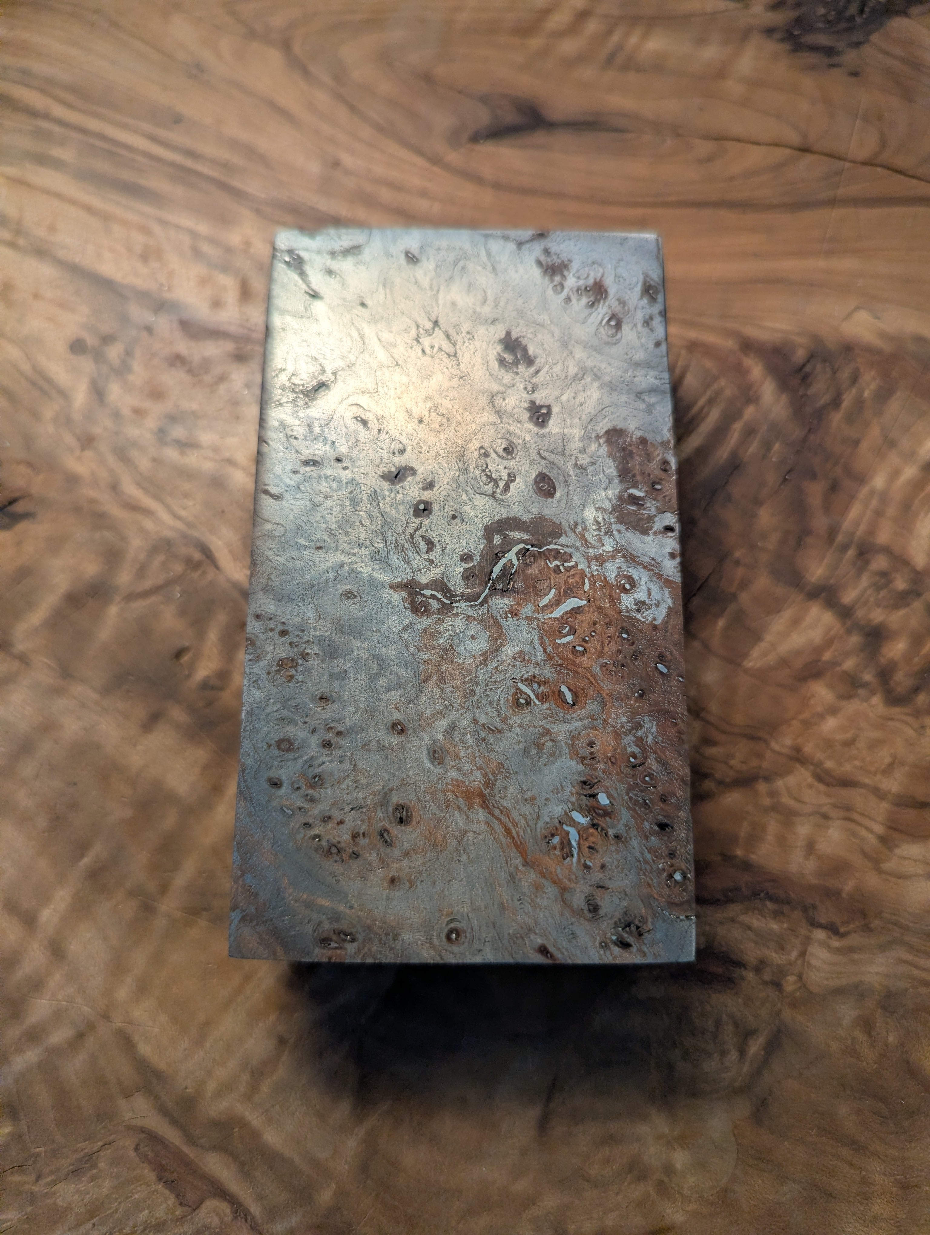 This is a material made by impregnating wood (maple) with metal. Its complex burl figure is metallically enhanced, reflecting light with a vivid, shimmering sparkle.