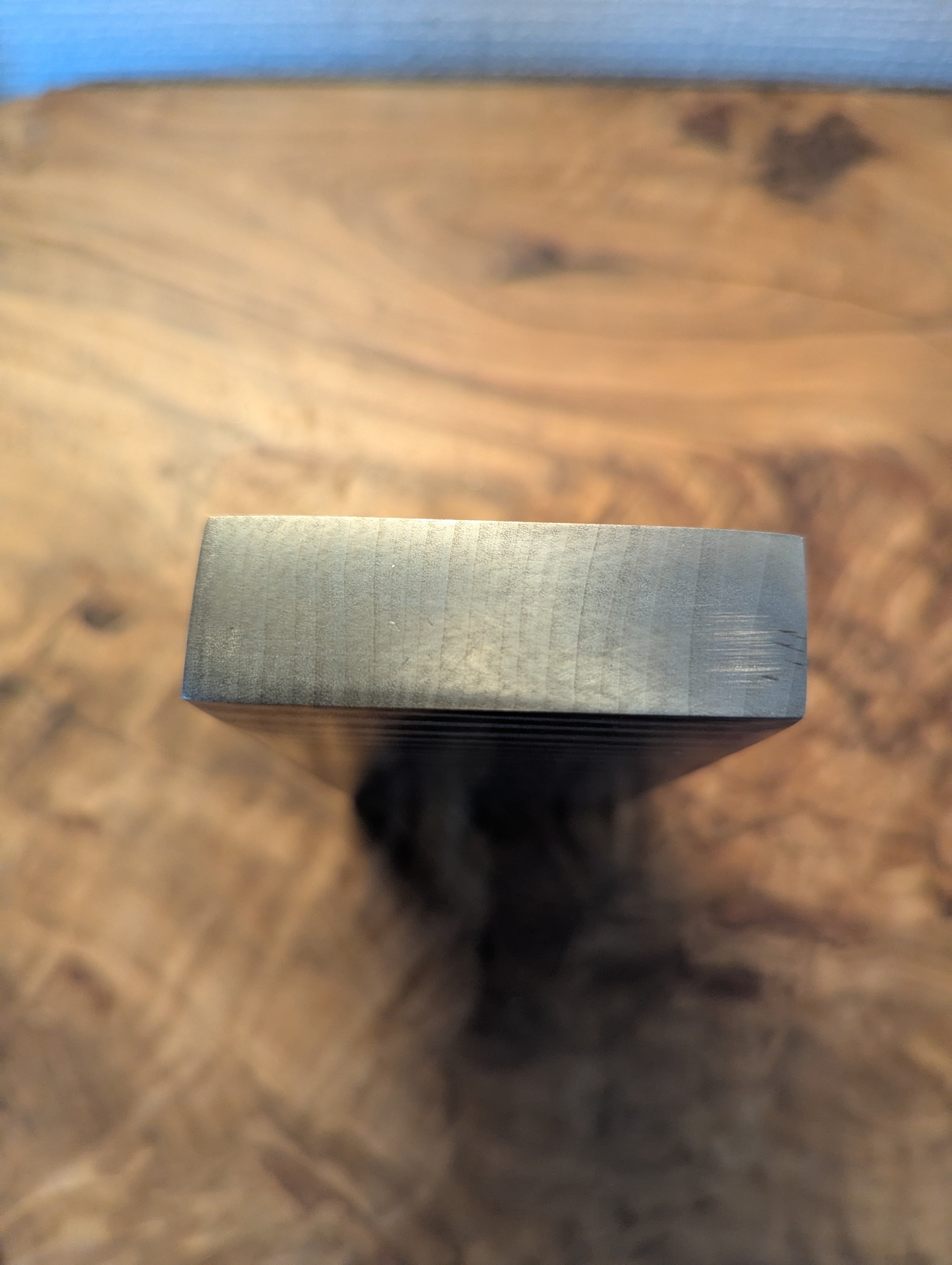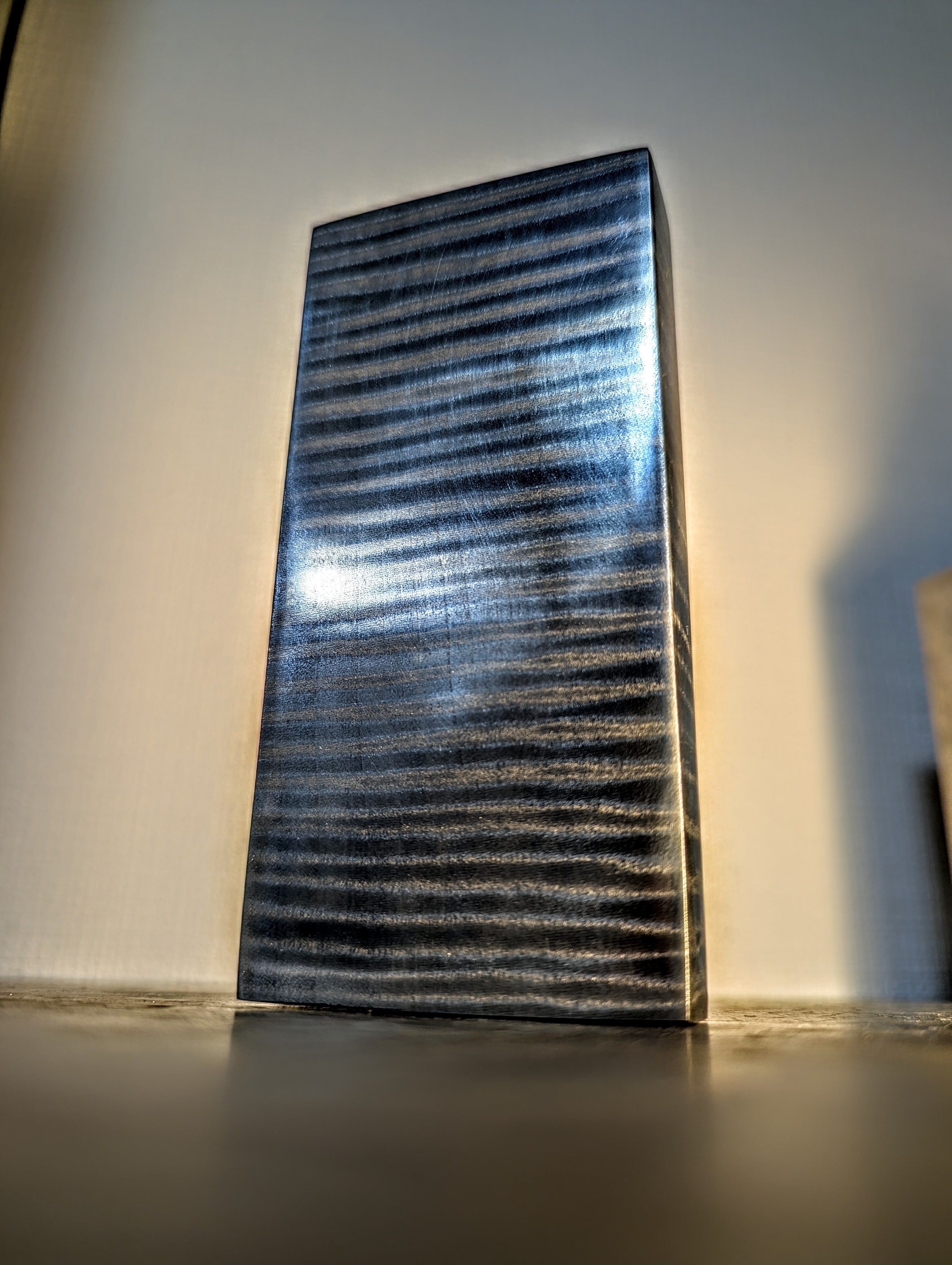 木材(トチ)に金属を含浸させた材料です。木目と縮杢が銀色に強調されており、光を反射してギラギラとダイナミックに輝きます。