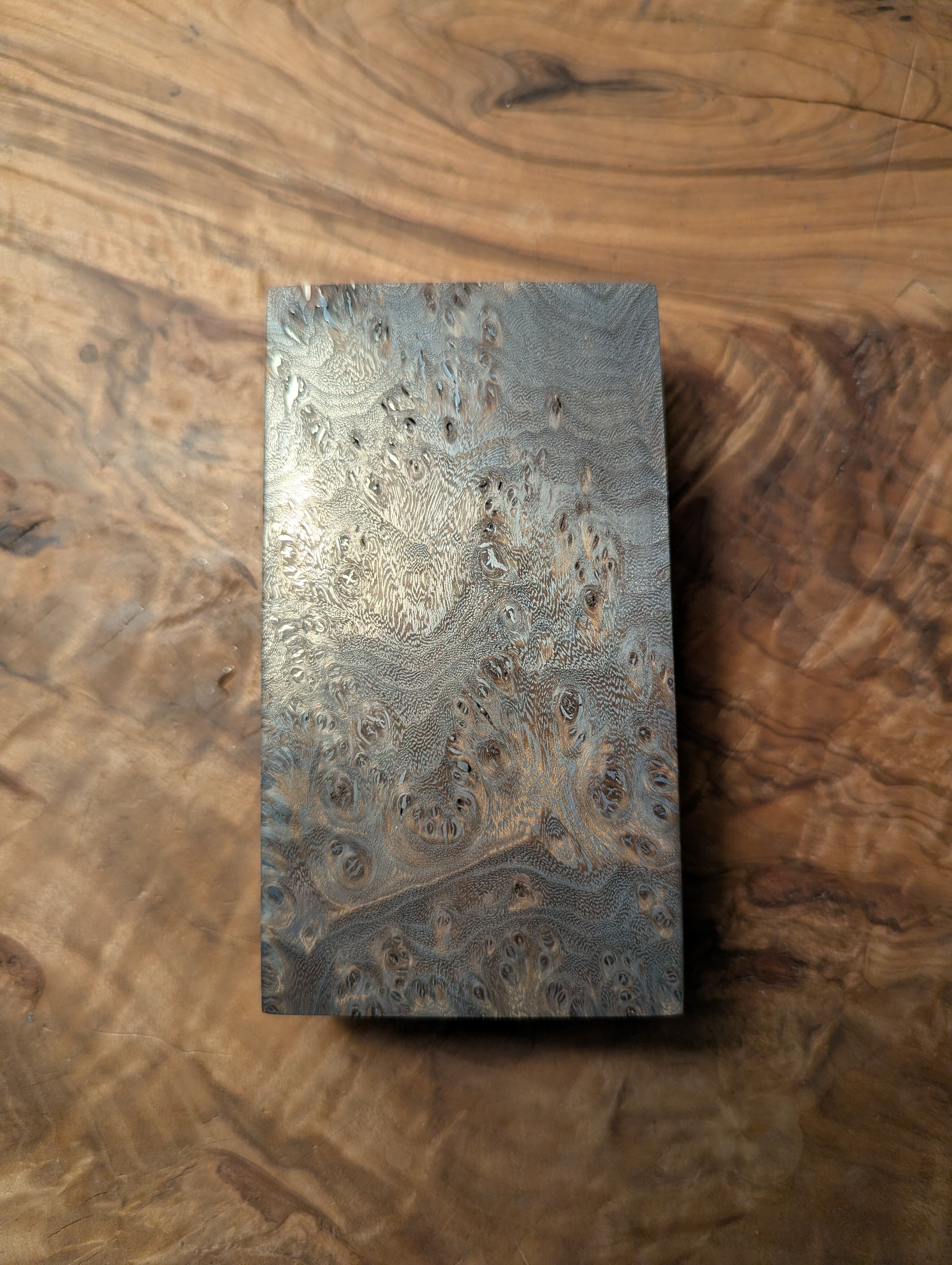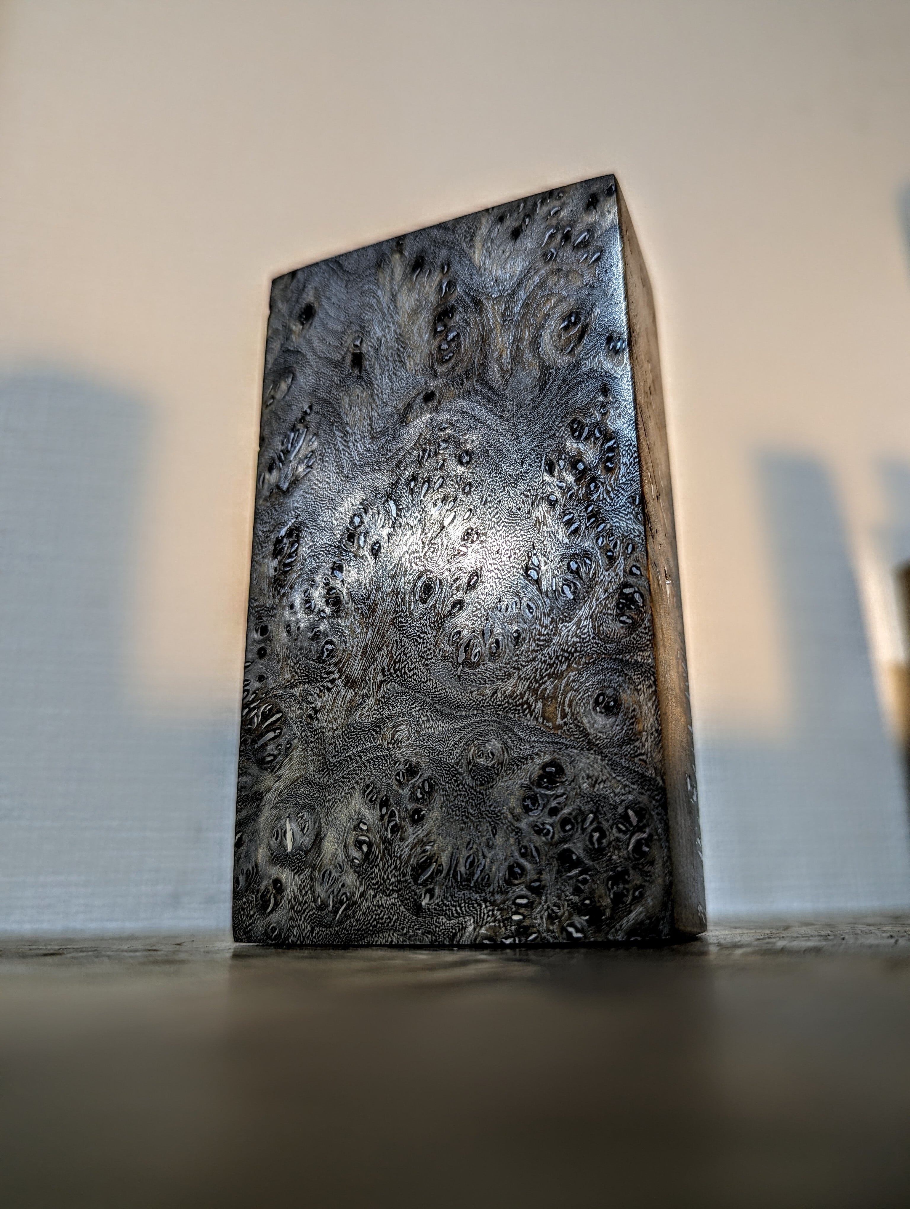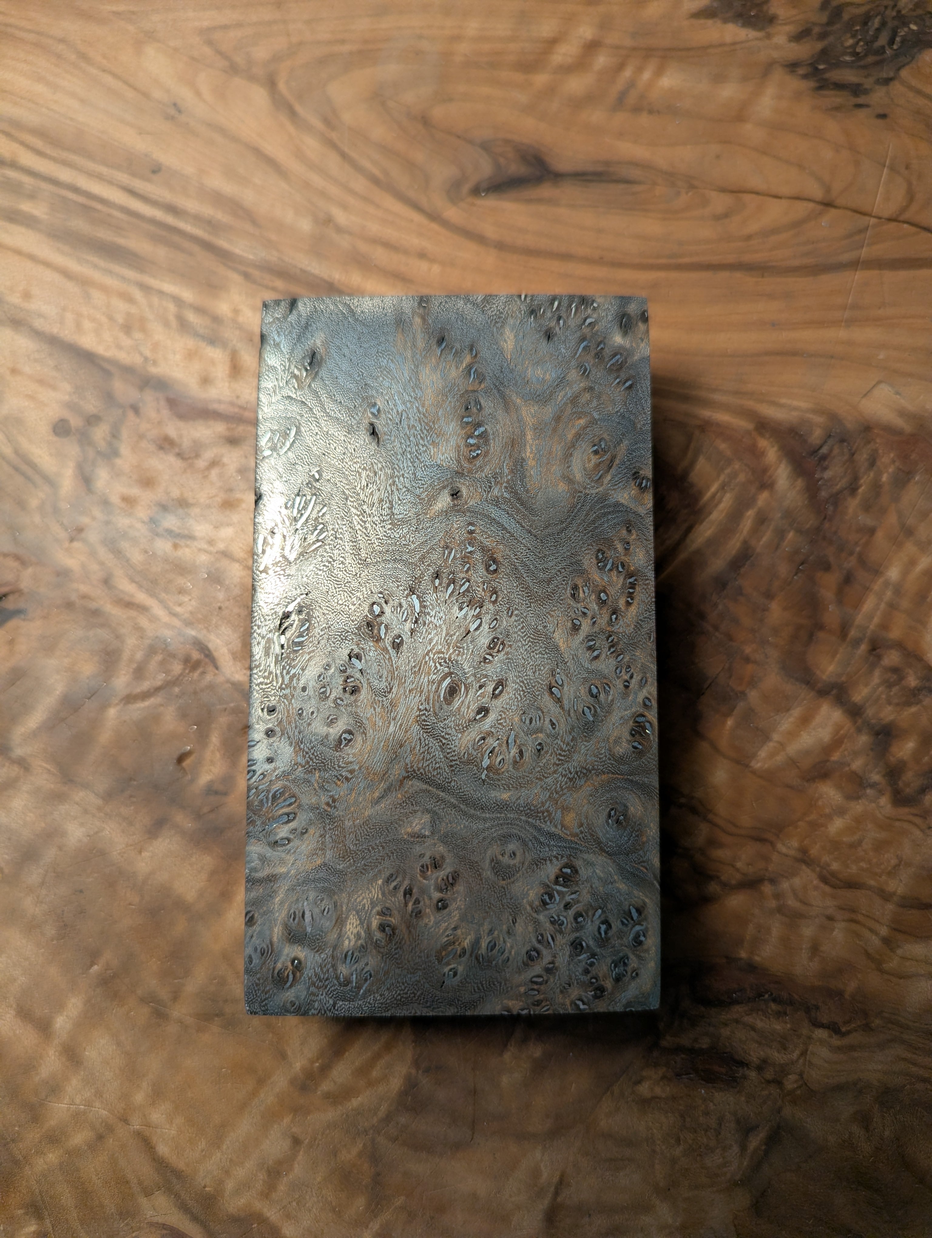 This is a material made by impregnating wood (birch) with metal. Its complex burl figure is metallically enhanced, reflecting light with a vivid, shimmering sparkle.