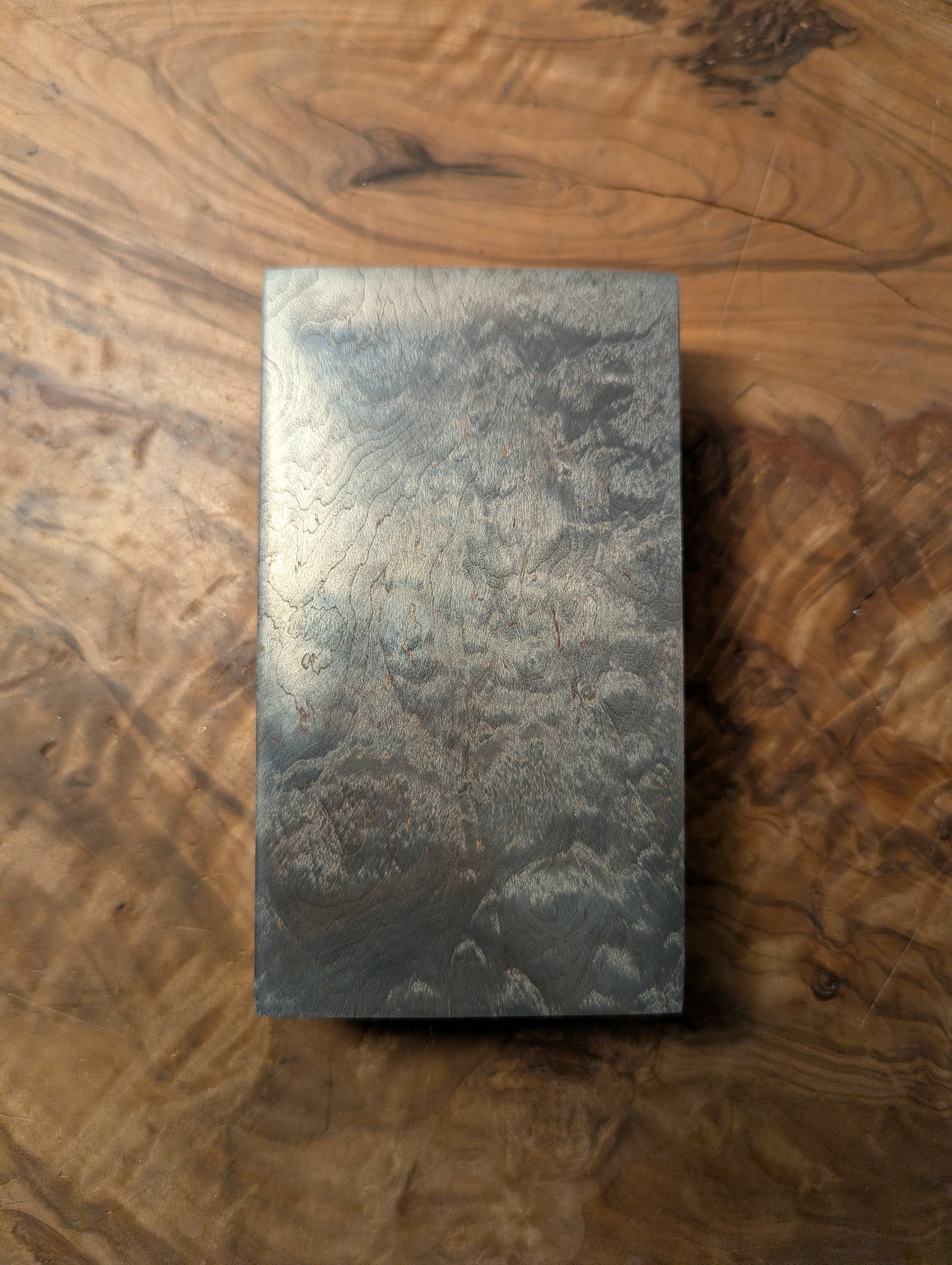 木材(メープル)に金属を含浸させた材料です。独特な玉杢がメタリックに強調されており、光を反射してギラギラと光ります。