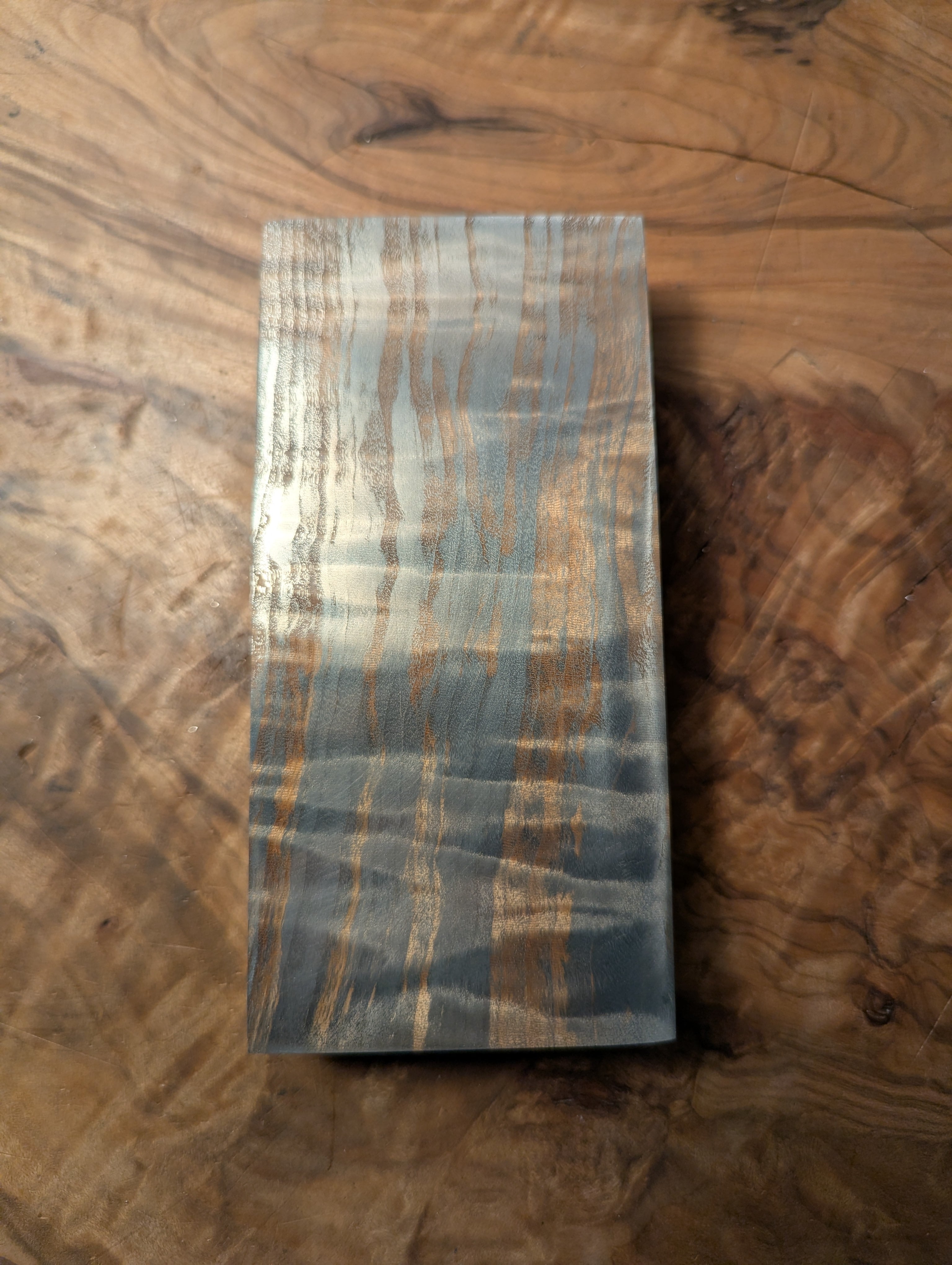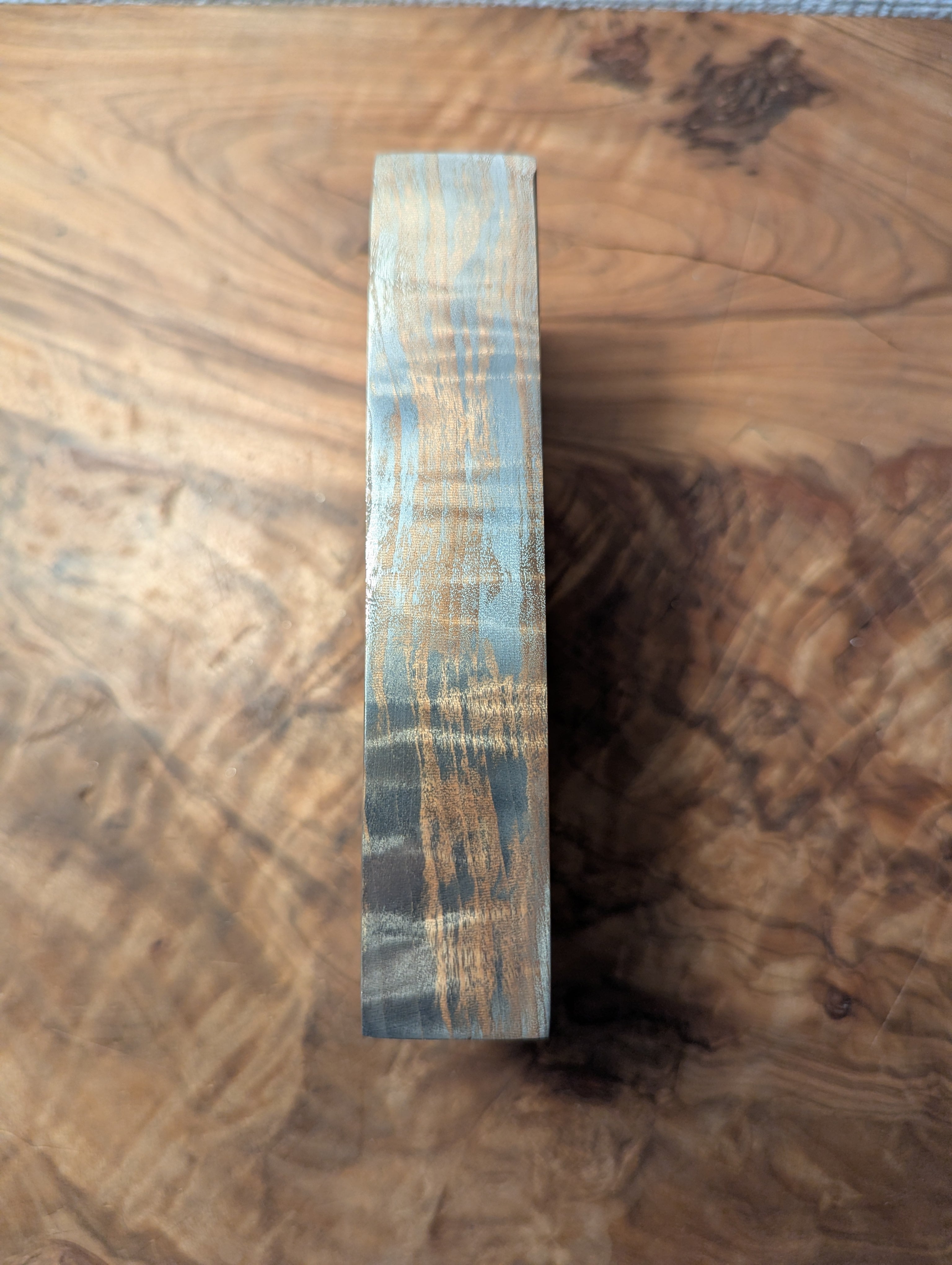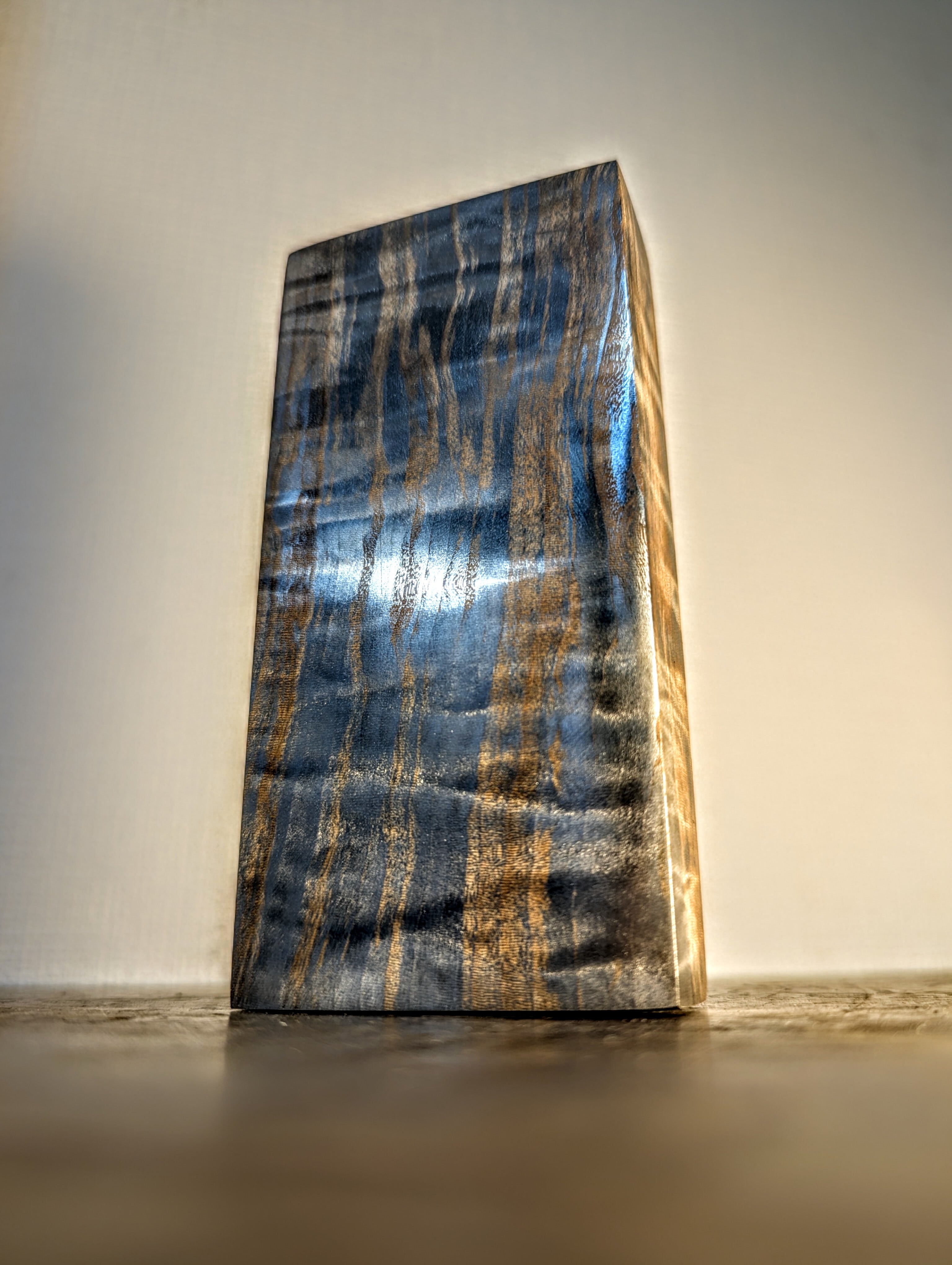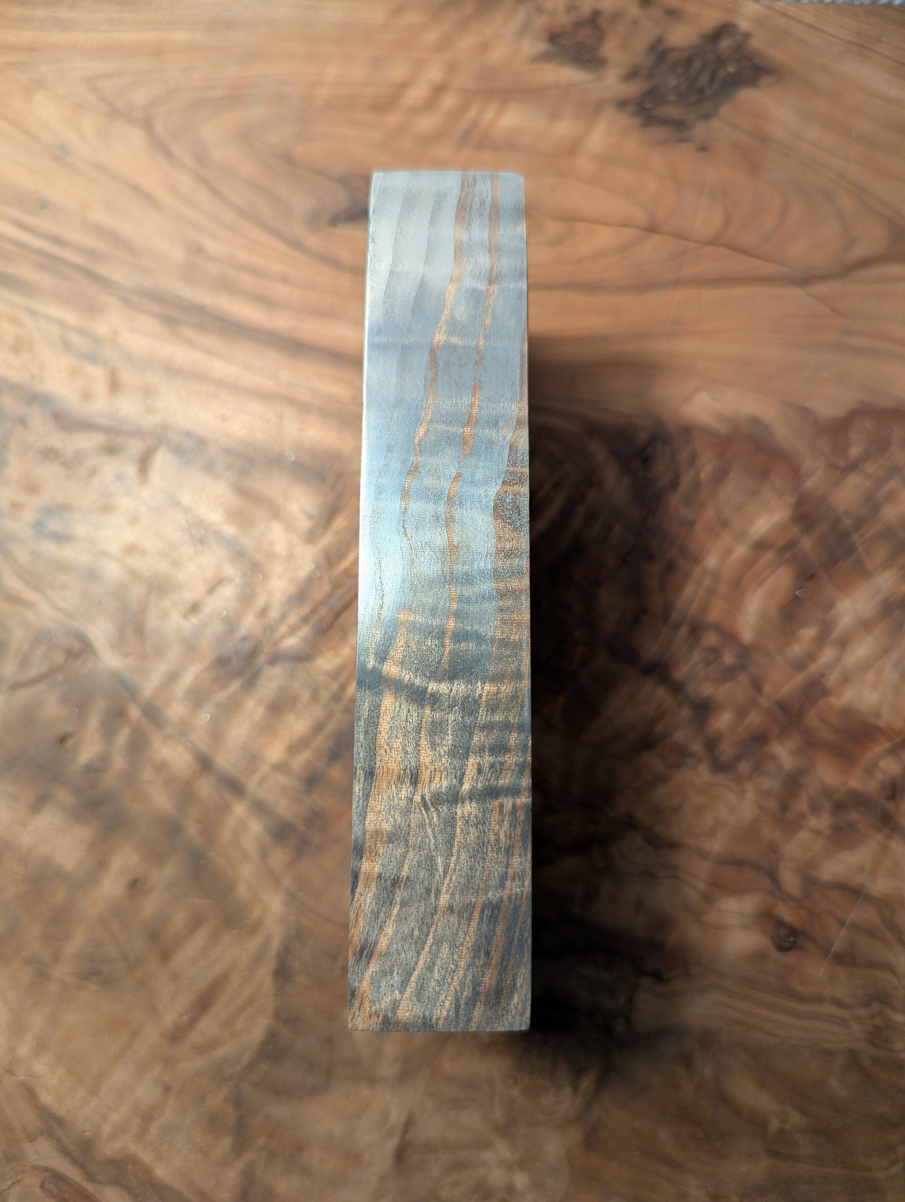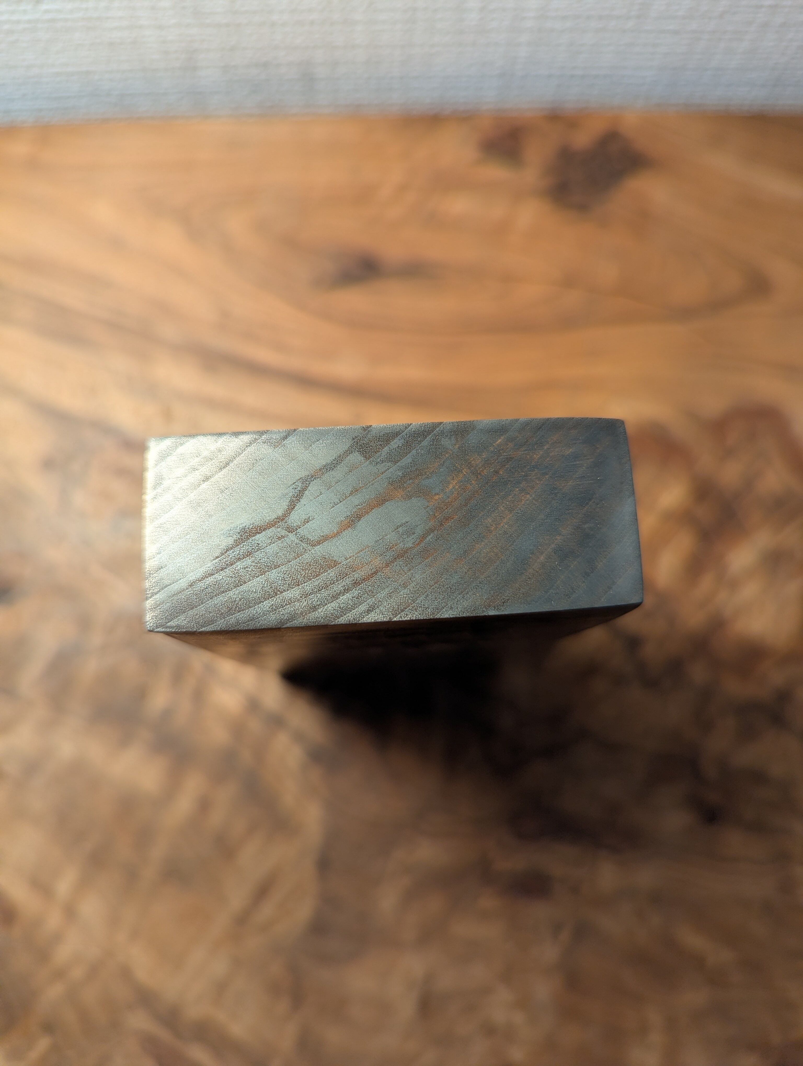 木材(トチ)に金属を含浸させた材料です。木目と杢が銀色に強調されており、光を反射してギラギラとダイナミックに輝きます。