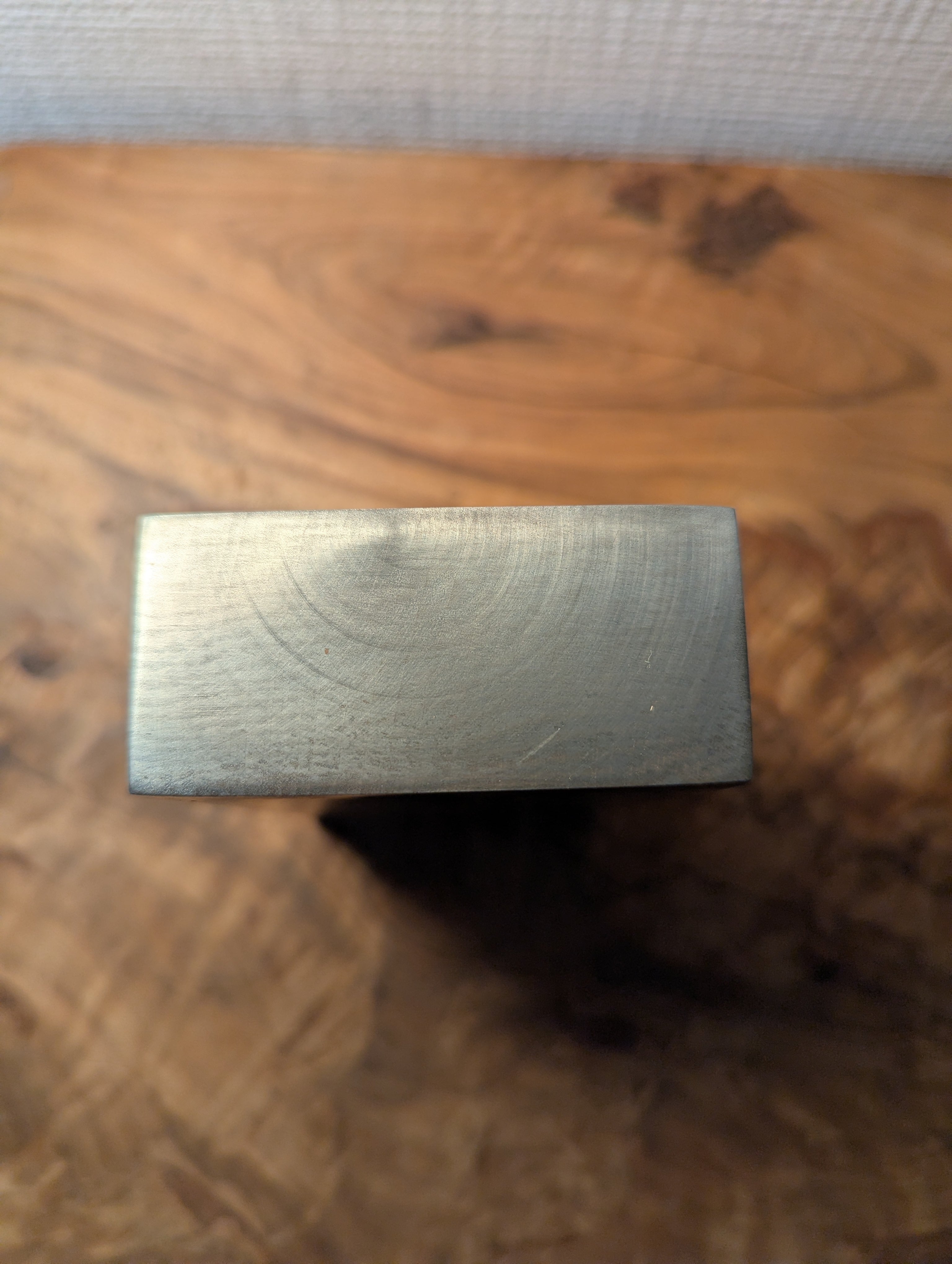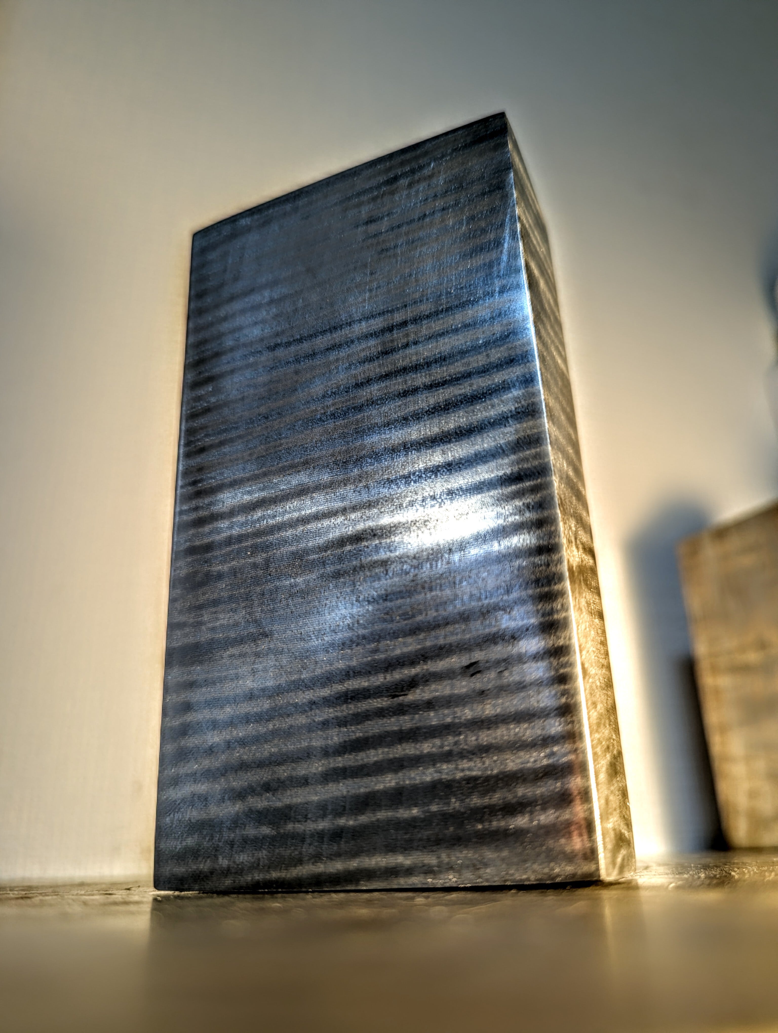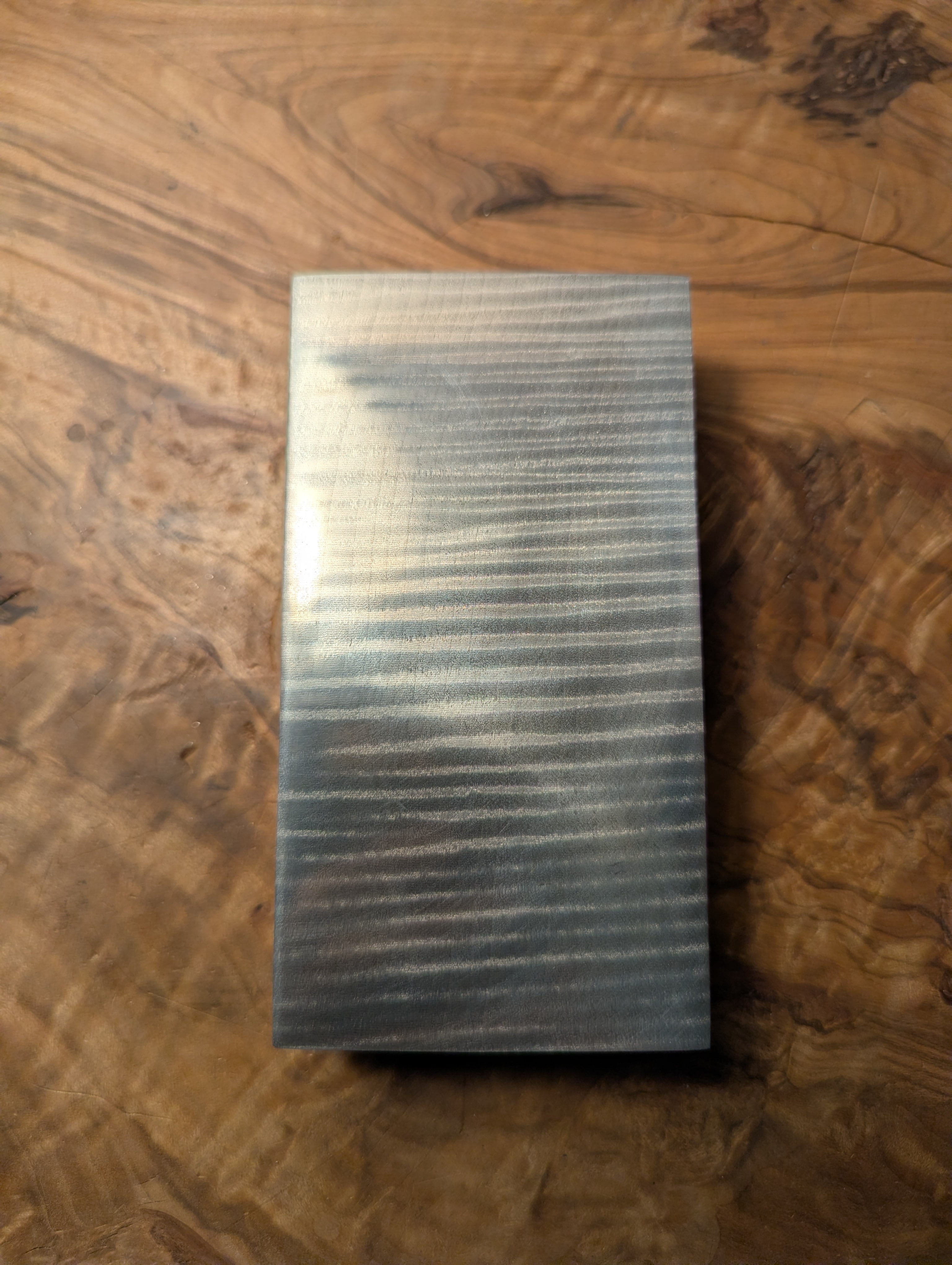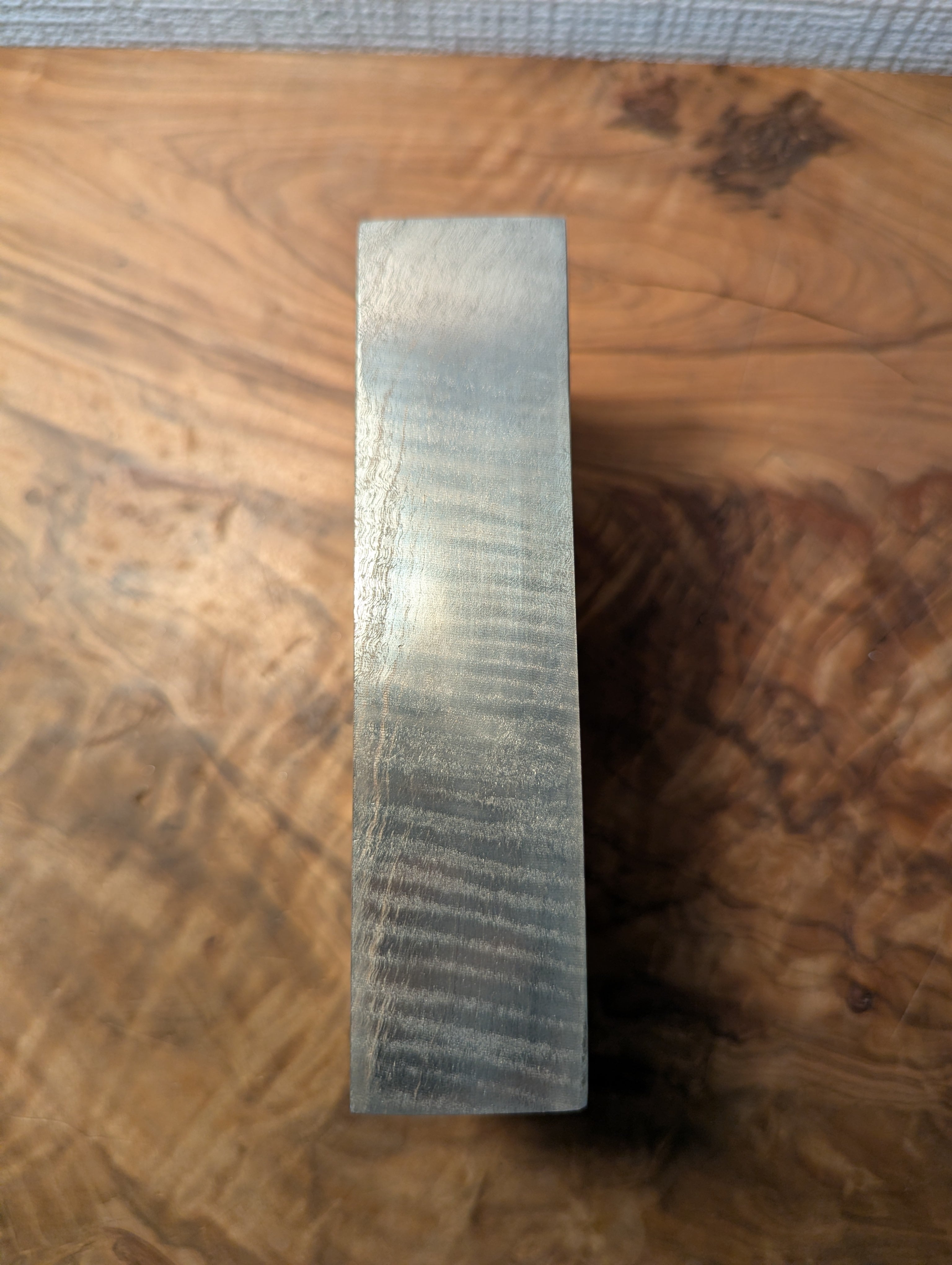 木材(トチ)に金属を含浸させた材料です。木目と縮杢が銀色に強調されており、光を反射してギラギラとダイナミックに輝きます。